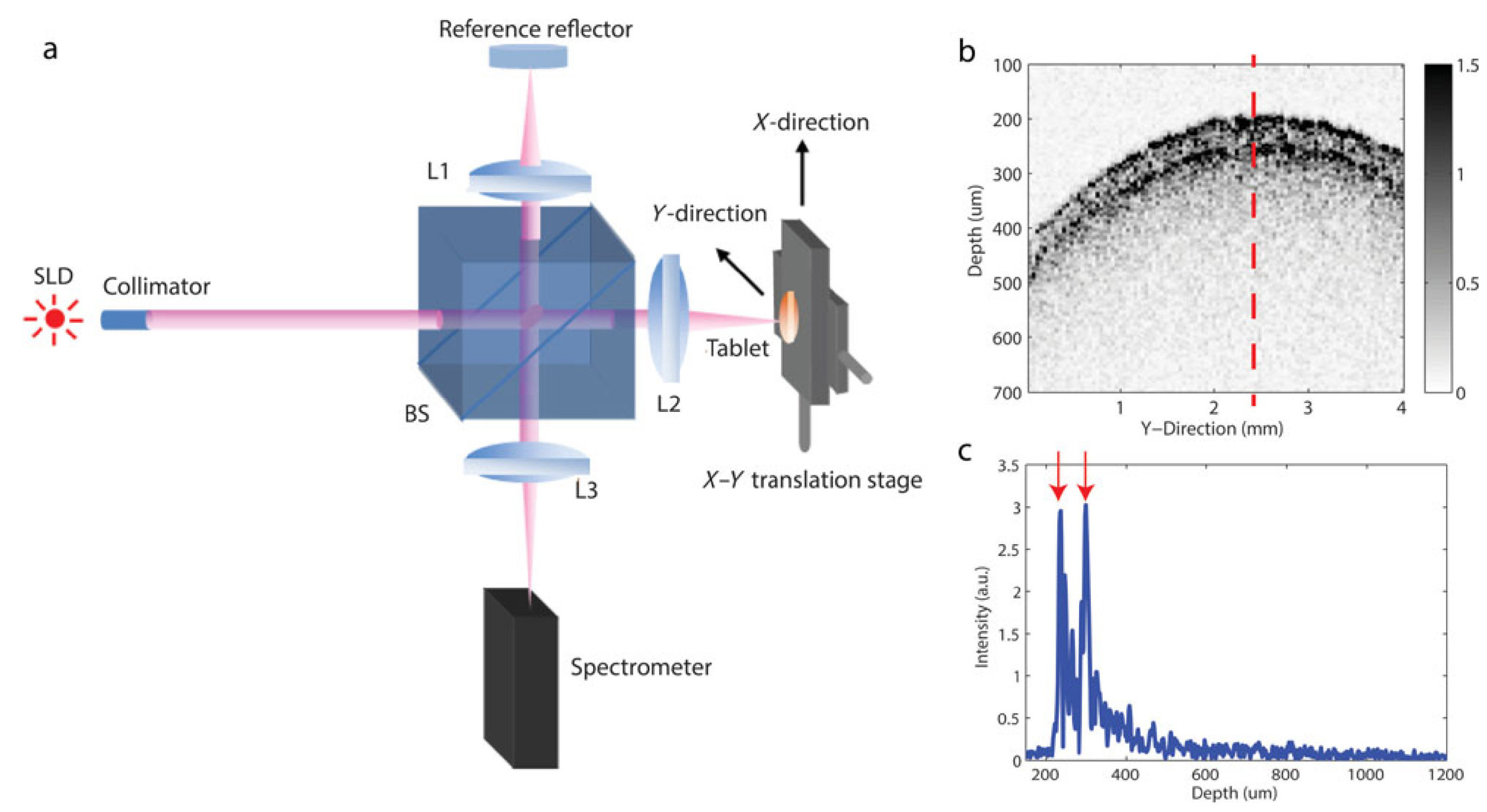 - Haindl, R.; Kern, A.; Deng, S.; Wolfgang, M.; Stranzinger, S.; Liu, M.; Drexler, W.; Leitgeb, R. Investigation of thin pharmaceutical coatings with ultra-high-resolution optical coherence tomography. In Proceedings of the European Conference on Biomedical Optics, Rahway, NJ, USA, 11 August 2023; Optica Publishing Group: Washington, DC, USA, 2023; p. 126321R. [Google Scholar]