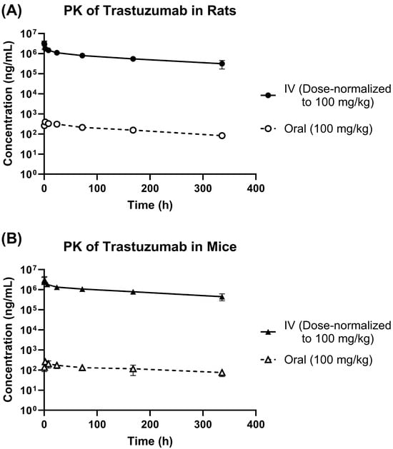 Preclinical PK of trastuzumab. (A) Plasma PK of trastuzumab in rats following intravenous (IV) and oral administration of 100 mg/kg dose. (B) Plasma PK of trastuzumab in mice following IV and oral administration of 100 mg/kg dose. Note: IV data was dose-normalized to 100 mg/kg for comparison.