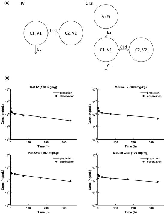 (A) Schematic of the two-compartment model that was used to characterize the plasma concentration vs. time profiles of trastuzumab in rats and mice following intravenous and oral administration. (B) Model-fitted PK profiles superimposed over the observed data.