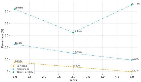 Changes in α-pinene, camphene, and bornyl acetate content in A. lowiana essential oil at 1, 3, and 5 years of age.