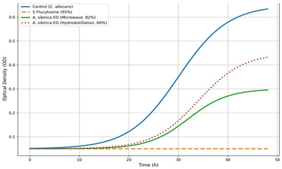 The fungal inoculum was adjusted using a multichannel pipette to achieve a final volume of 100 µL per well. The highest fungistatic concentration of the oil extract was 256 µg/mL. 5-Flucytosine (1 µg/mL) served as a positive control. Fungal growth was monitored by measuring optical density at 600 nm using a microplate reader (BMG Labtech Reader, Ortenberg, Germany) at 37 °C over a 48-h period. Quantitative comparison of the areas under the growth curves across 48 h provided relative growth values, expressed as a percentage of the untreated control (Figure 3).