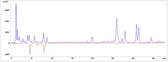 The dotted red line (negative values) represents the activity of compounds capable of scavenging free radicals. The presence of negative peaks within the 10–20 min region indicates that certain constituents of the oil exhibit pronounced radical-scavenging activity.