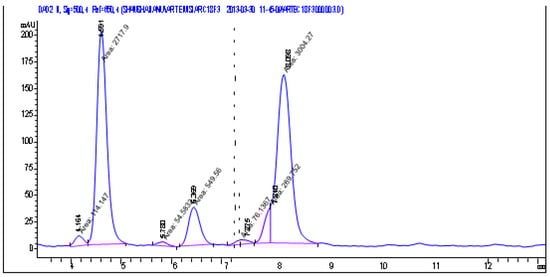 - Between the large peaks, several smaller peaks of lower intensity are visible in the range of 6–7 min. These represent minor components present in smaller amounts.