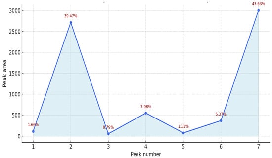 Among the identified components, peaks 2 and 7 exhibited the highest contributions to the overall antiradical activity, accounting for 39.47% and 43.63%, respectively. Together, these two fractions represented more than 83% of the total activity, indicating that a limited number of major constituents predominantly determine the oil’s antioxidant potential.