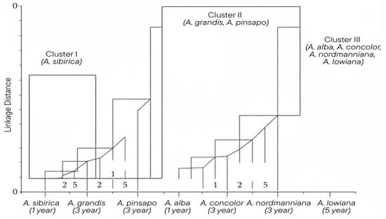 Hierarchical clustering (Ward linkage) of essential oil composition across seven Abies species at different ages. Three main clusters are evident: Cluster I (A. sibirica), Cluster II (A. grandis, A. pinsapo), and Cluster III (A. alba, A. concolor, A. nordmanniana, A. lowiana).