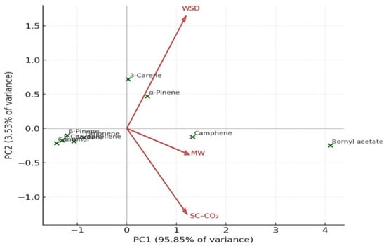 Figure 11 illustrates the corresponding PCA biplot, which integrates both compound positioning and the loading vectors of the extraction methods. The direction and length of each vector indicate the magnitude and influence of each extraction process on the variance structure. Compounds such as bornyl acetate and camphene are aligned with the vectors of SC–CO2 and MASD extraction, suggesting that these non-thermal or mild-thermal techniques promote the recovery of oxygenated and high-molecular-weight terpenes. Conversely, α-pinene and 3-carene are positioned closer to the WSD vector, indicating their dominance under conventional hydrodistillation due to their higher volatility and lower polarity.
