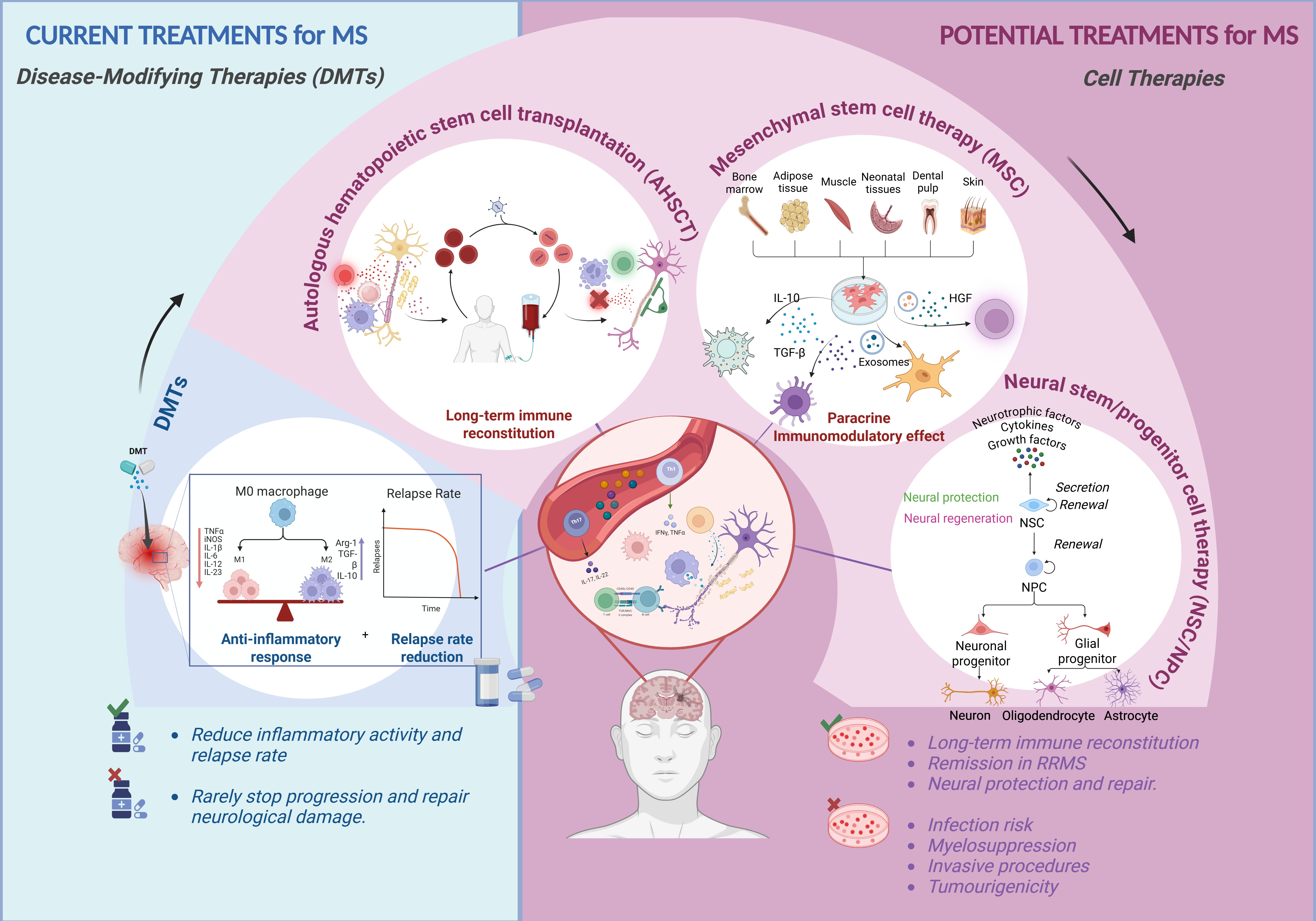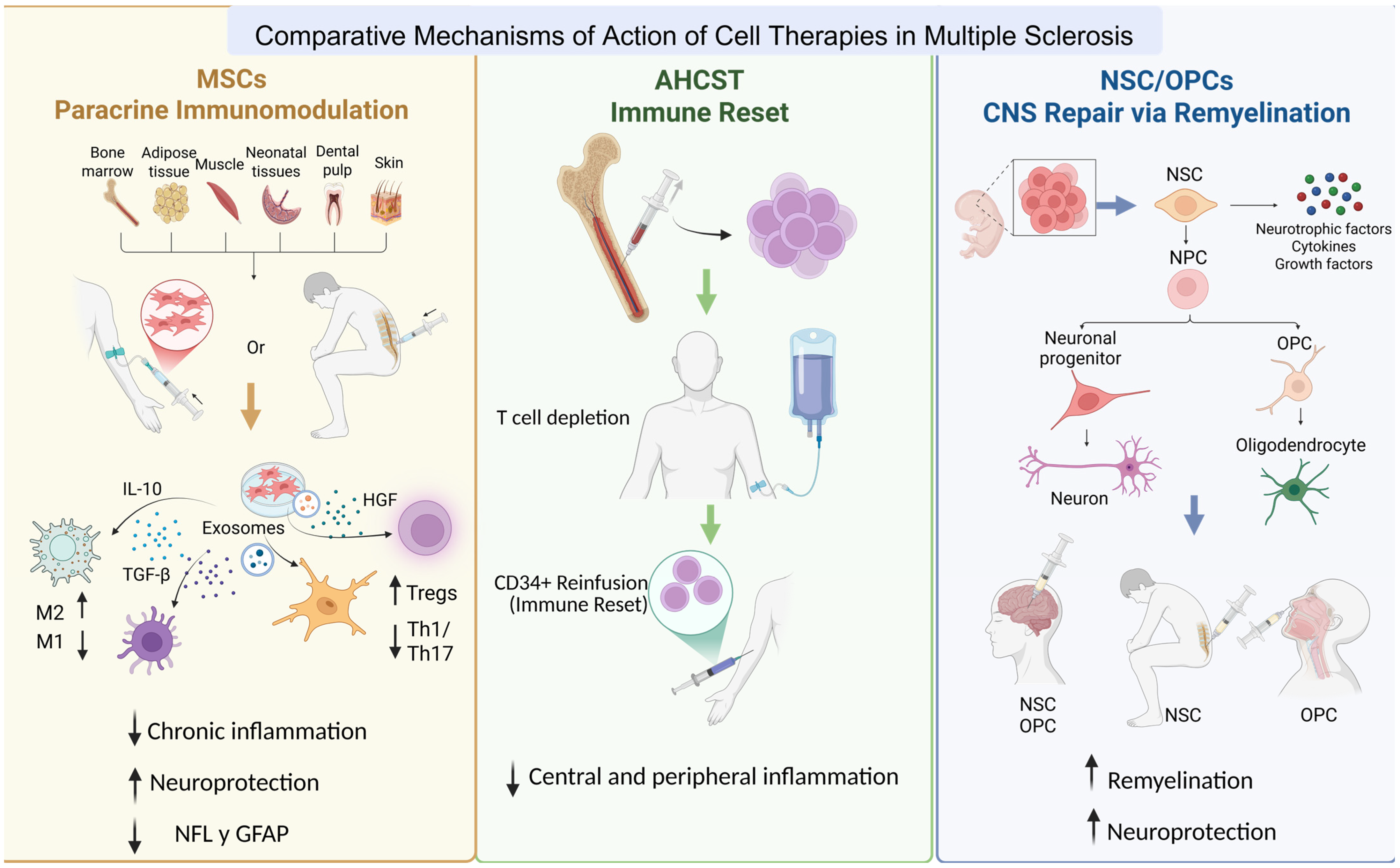 From an immunological perspective, cell therapies suppress autoreactive responses and restore immune balance by promoting regulatory populations such as Tregs and Bregs, downregulating proinflammatory cytokines, and modulating microglial activity. The clearest example is autologous haematopoietic stem cell transplantation (AHSCT), which combines immune ablation and reconstitution to achieve a functional “reset” of the immune repertoire [