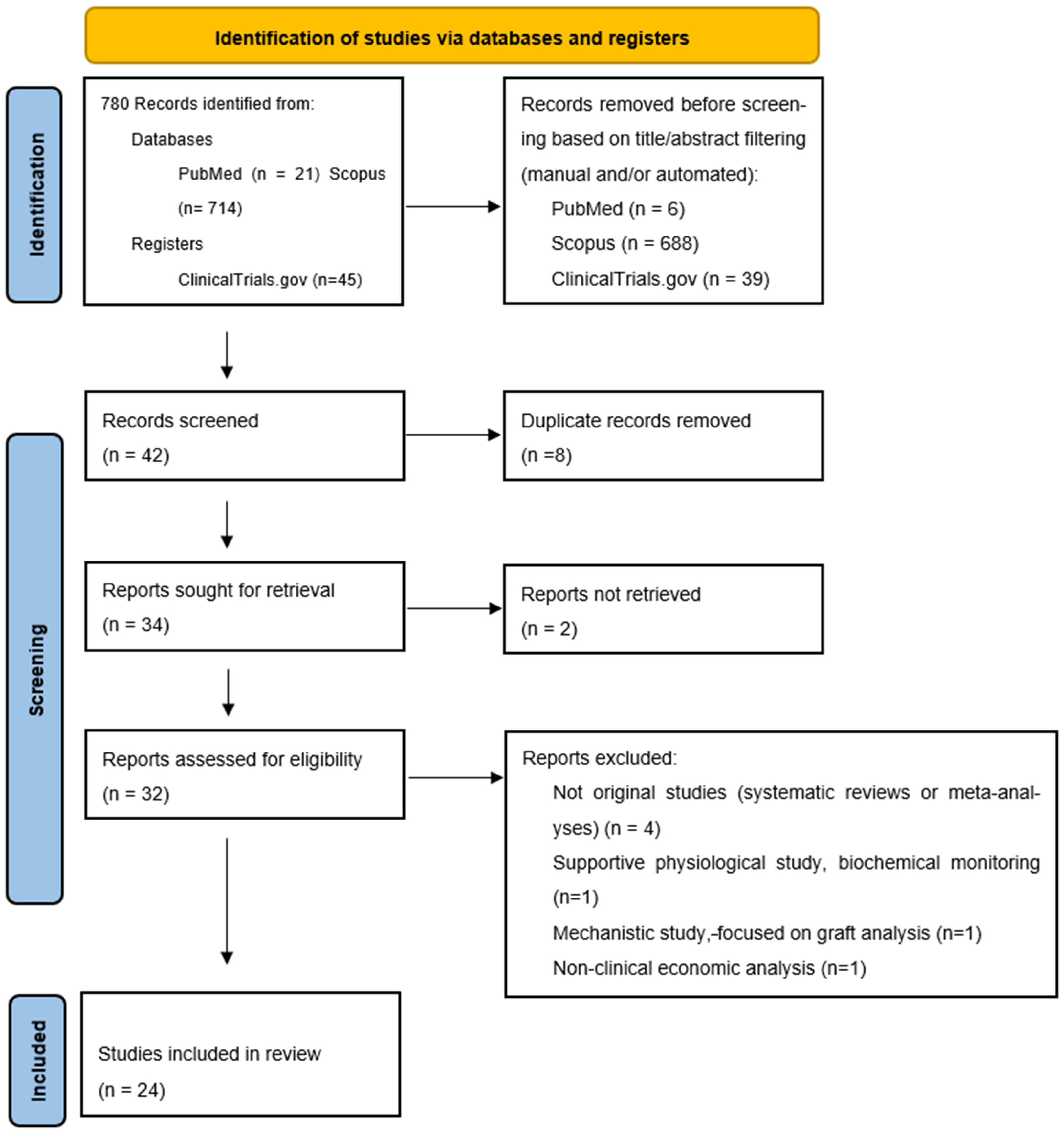 All records retrieved from the three sources were compiled, and duplicates were removed. A total of 42 unique records were screened. After excluding eight duplicates, 34 studies remained for title and abstract screening. Full-text articles were sought for all 34 studies; however, two could not be accessed despite repeated attempts. Of the 32 studies undergoing full-text review, eight were excluded because they were systematic reviews, meta-analyses, or lacked clinical outcome data in human subjects. The final qualitative synthesis included 24 studies. The PRISMA flow diagram summarizing these steps is presented in