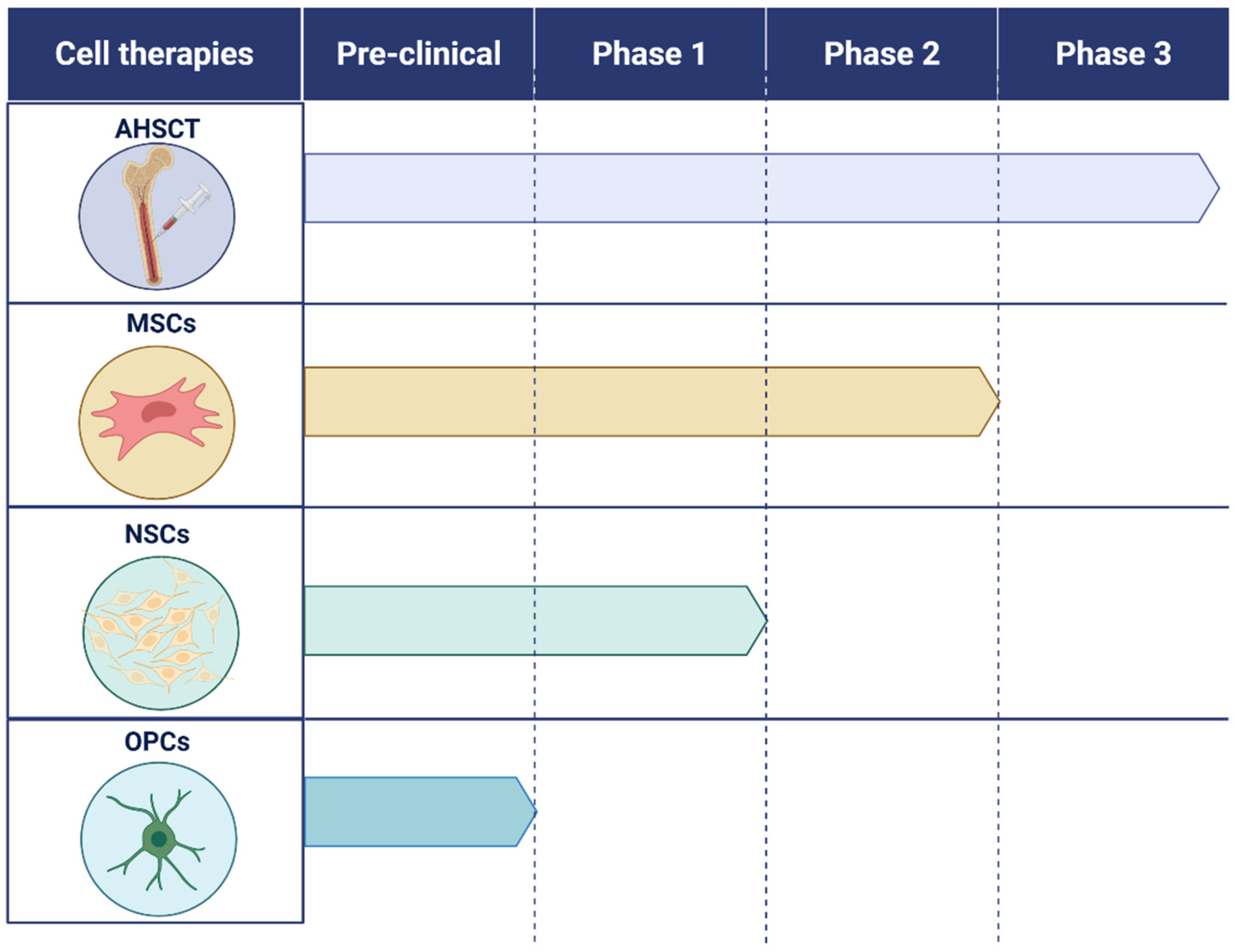 These treatments aim to restore immune balance, reduce chronic inflammation, and support neural repair through trophic and regenerative mechanisms. Several cell types are under investigation, including autologous haematopoietic stem cells (AHSCT), which aim to reset the immune system after high-dose immunosuppression; mesenchymal stem cells (MSCs), which exert paracrine immunomodulatory and neuroprotective effects; and neural stem or progenitor cells (NSCs), which may contribute directly to remyelination and repair [