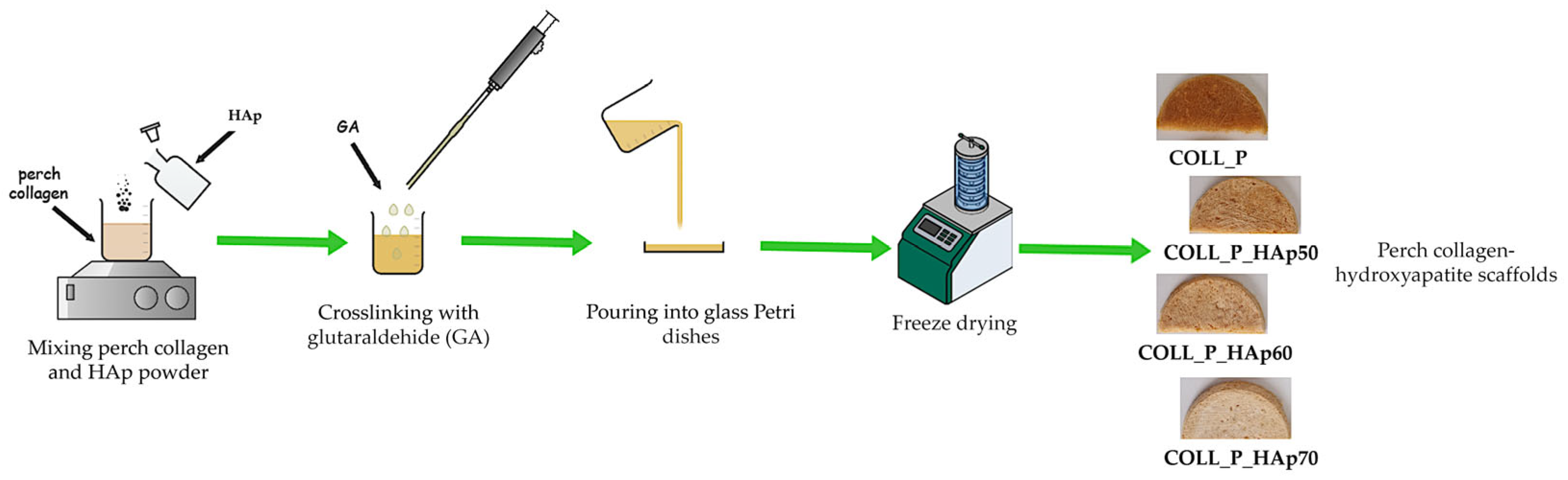 2.2.1. Preparation of Perch Collagen–HAp Scaffolds