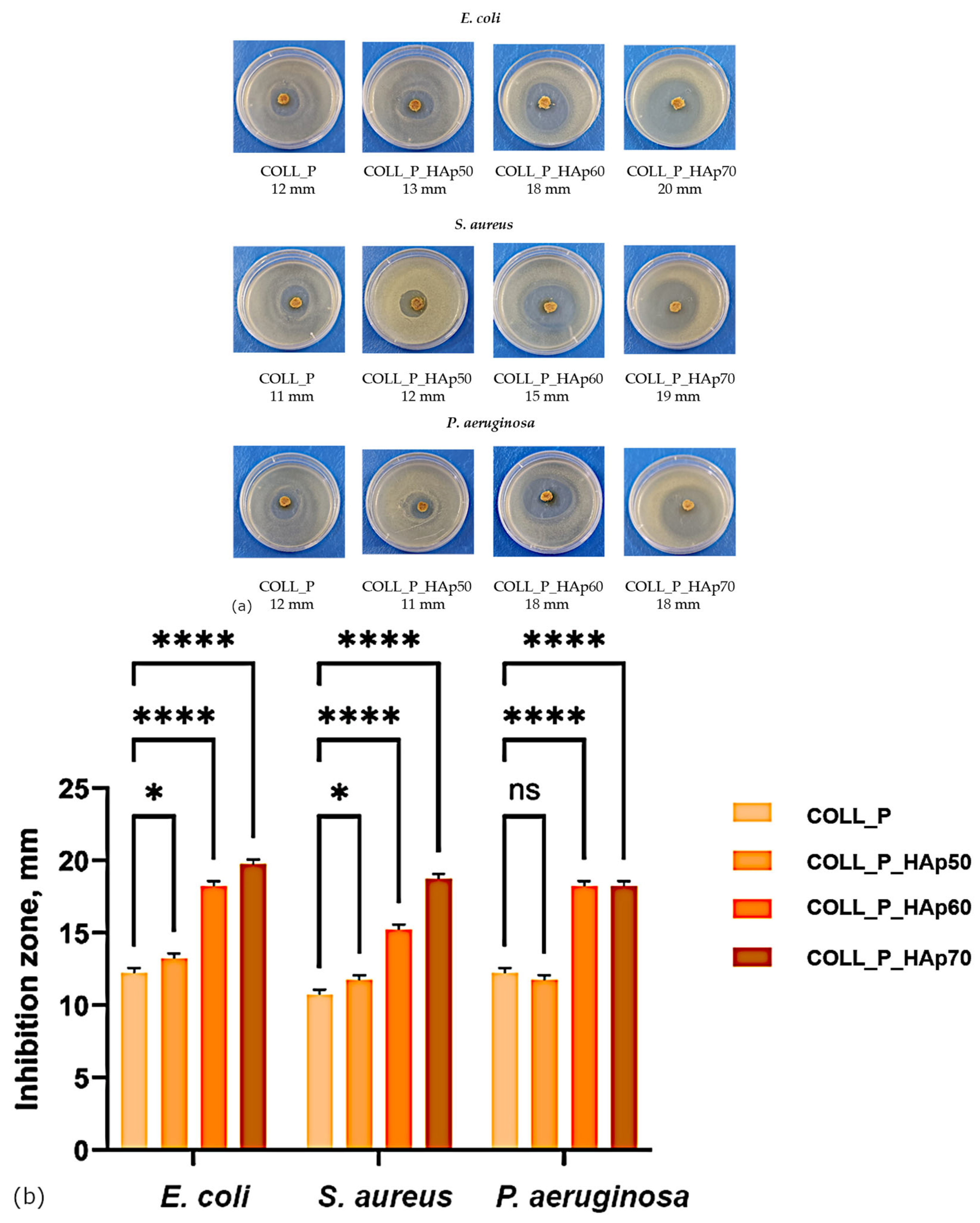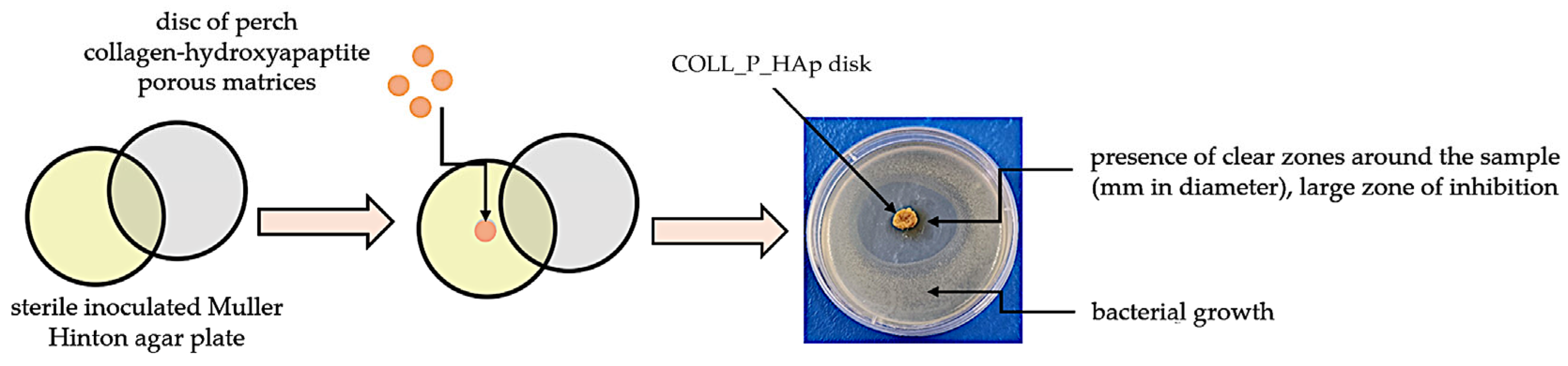 2.2.8. Antimicrobial Activity of Collagen–HAp Scaffolds