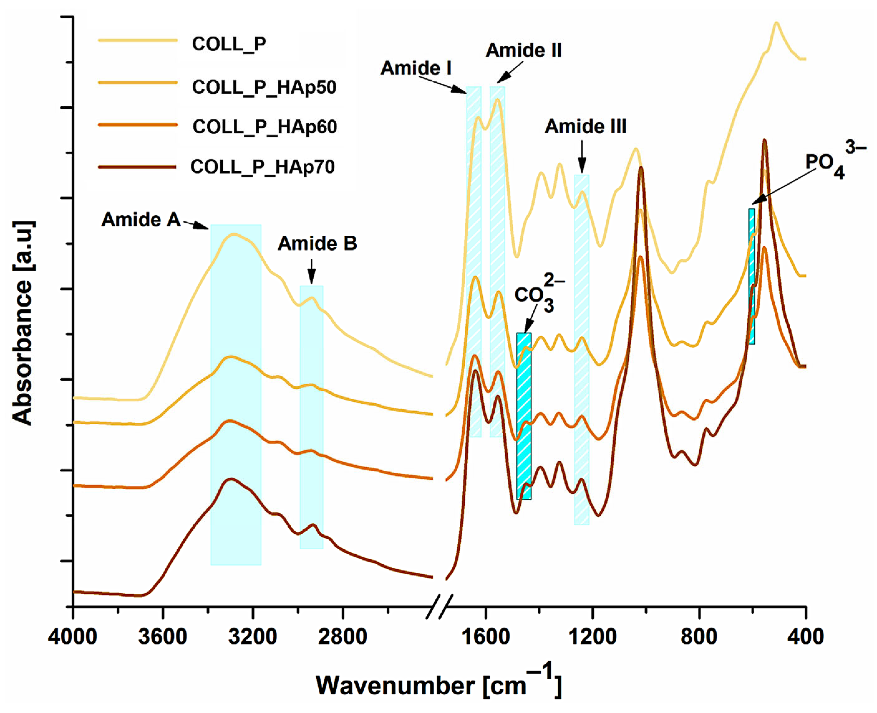 3.1. Structural Analysis of Perch Collagen–HAp Scaffolds—FT-IR Spectra