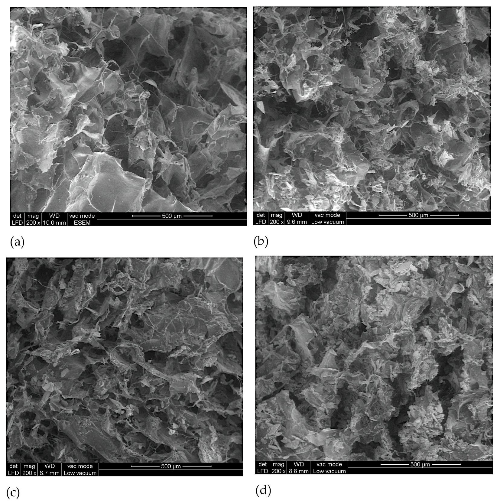 3.2. Water Absorption of Perch Collagen–HAp Scaffolds