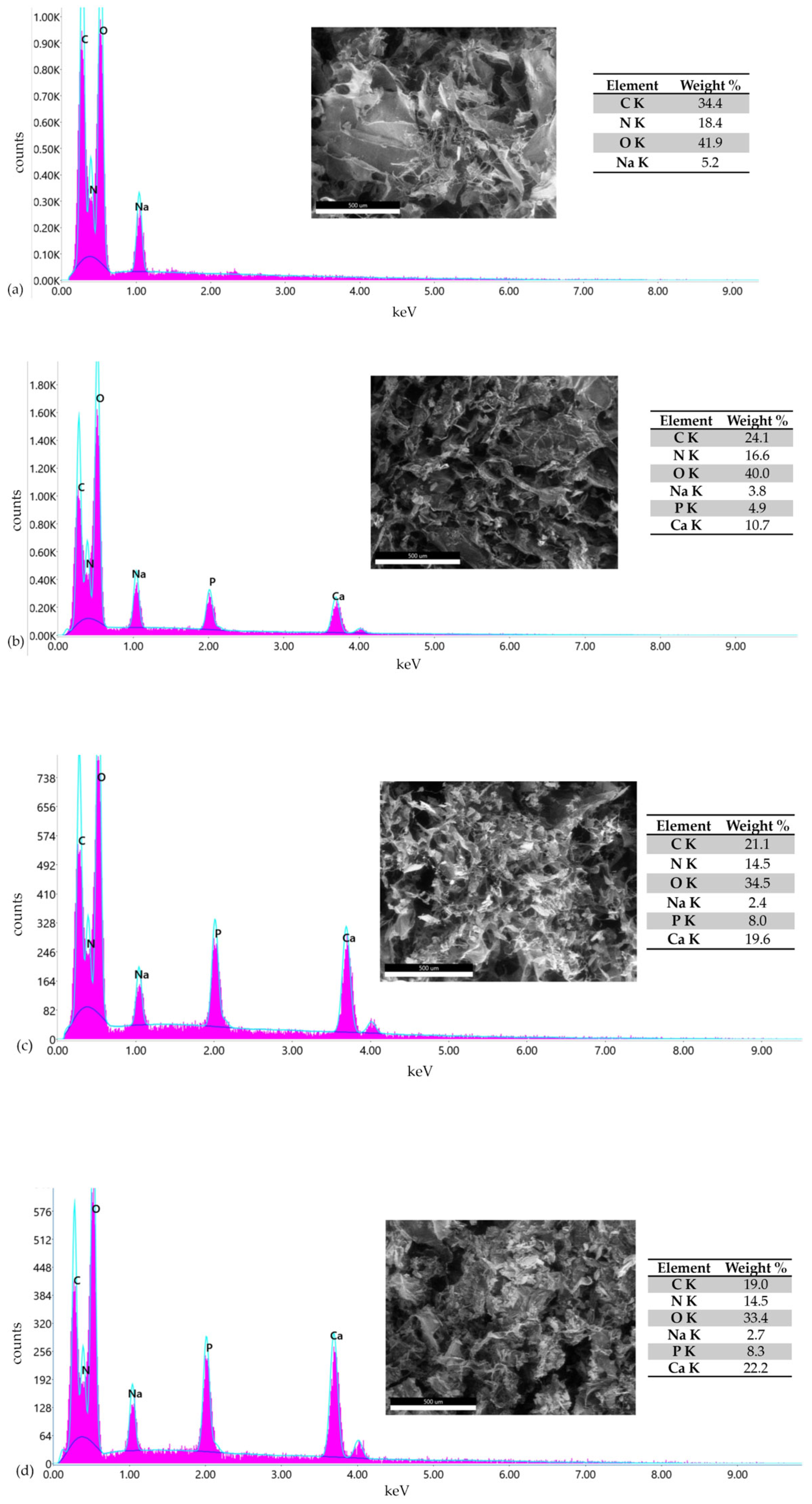 2.2.4. Scanning Electron Microscopy (SEM) of Collagen-HAp Scaffolds and X-Ray Energy-Dispersive Spectrometry (X-EDS)