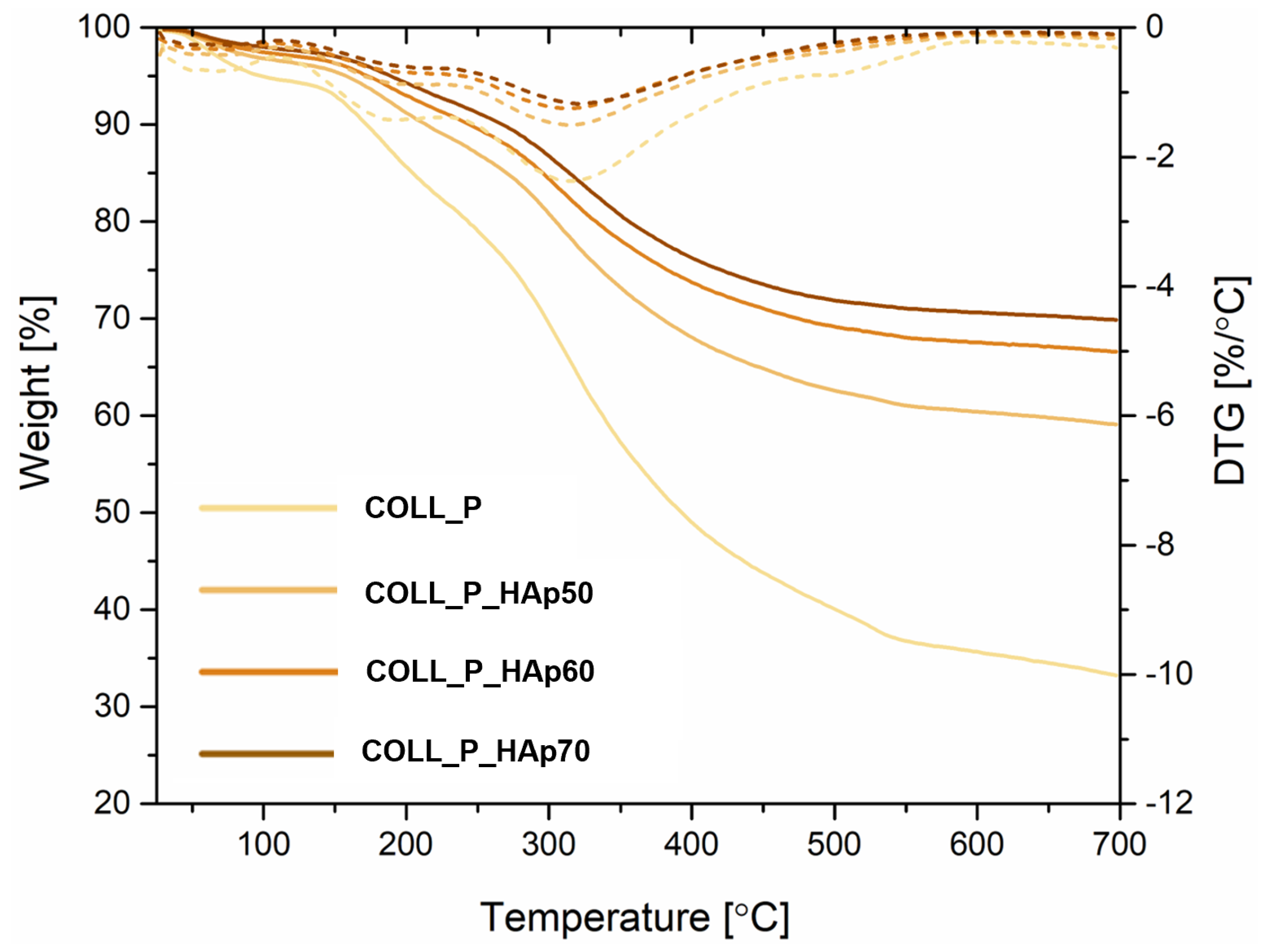 2.2.7. Thermogravimetric Analysis (TGA) of Collagen–HAp Scaffolds