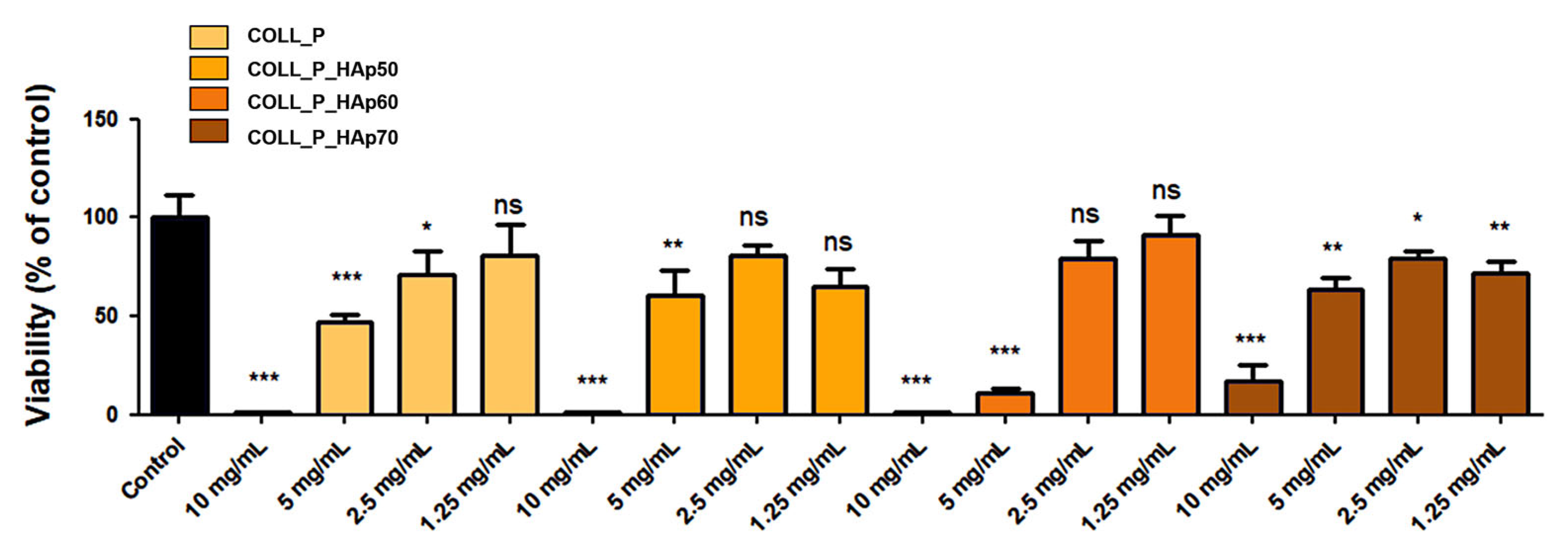 3.5. Enzymatic Degradation of Perch Collagen–HAp Scaffolds