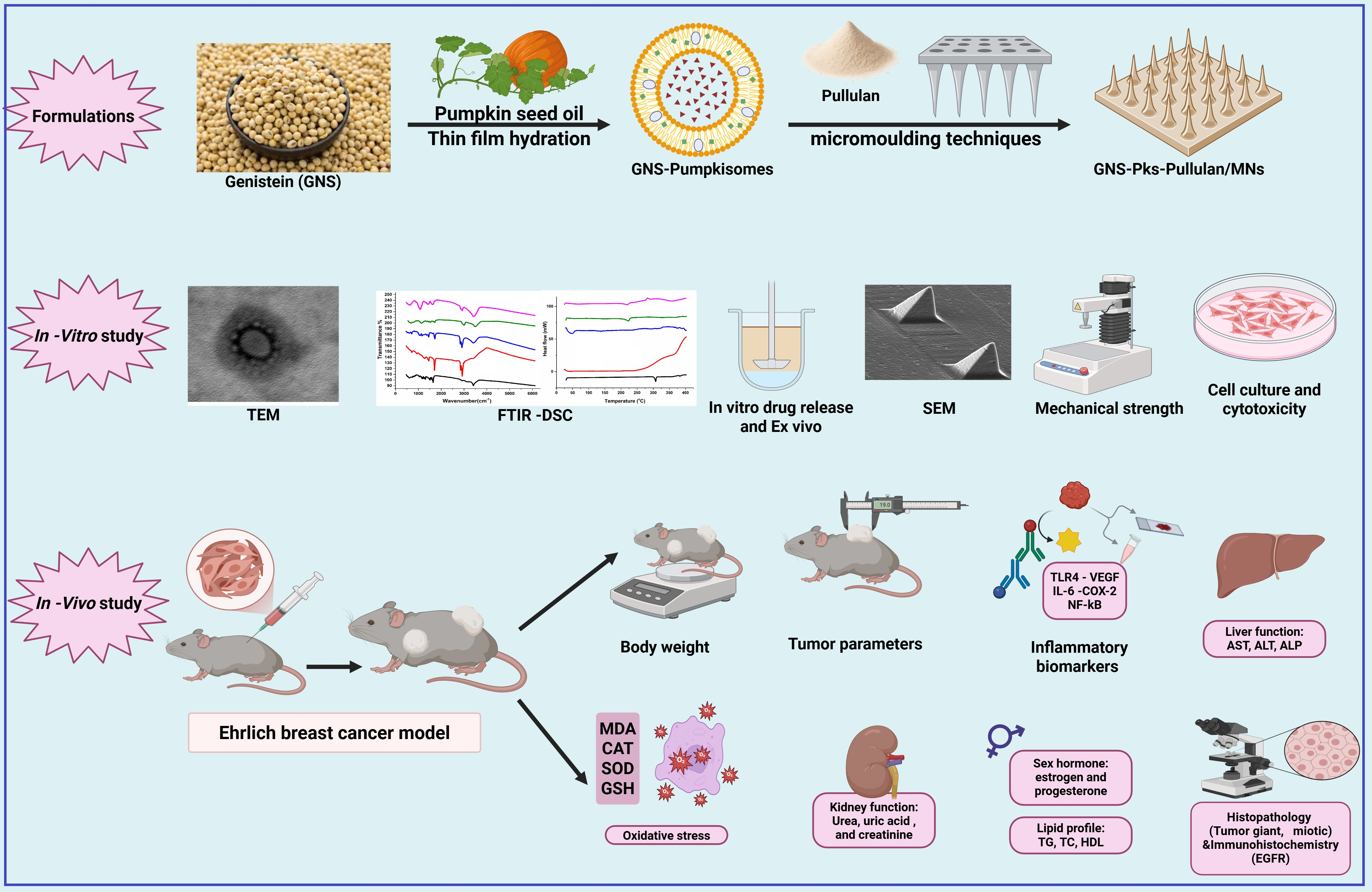 APA StyleElhabal, S. F., S. Shoela, M., Elrefai, M. F. M., E. Hassan, F., Morsy, S. A. A., Younis Abdelgawad, W., K. Ali, S., M. Mohie, P., M. Elsharkawy, A., Ewedah, T. M., Mousa, I. S., Fouad, M. A., Allam, S., & Hamdan, A. M. E. (2026). Harnessing Dual Power: Genistein-Loaded Pumpkisomes in Pullulan Microneedles for Potent Antioxidant and Anticancer Therapy Against Ehrlich Ascites Carcinoma and Breast Cancer Cells. Pharmaceutics, 18(1), 36. https://doi.org/10.3390/pharmaceutics18010036