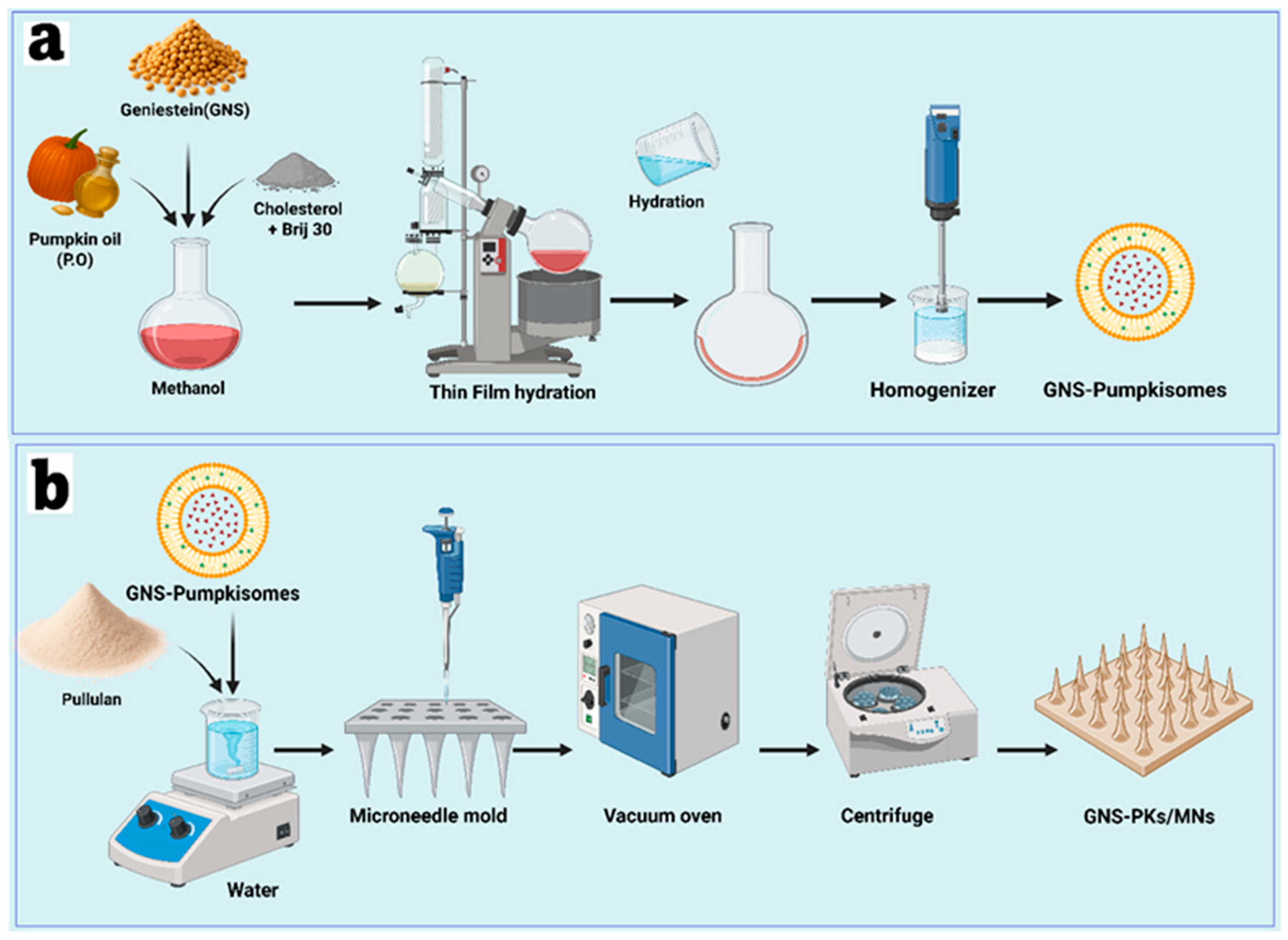 | GNS-PKs/MNs | Genistein-loaded Pumpkisomes in Microneedles |