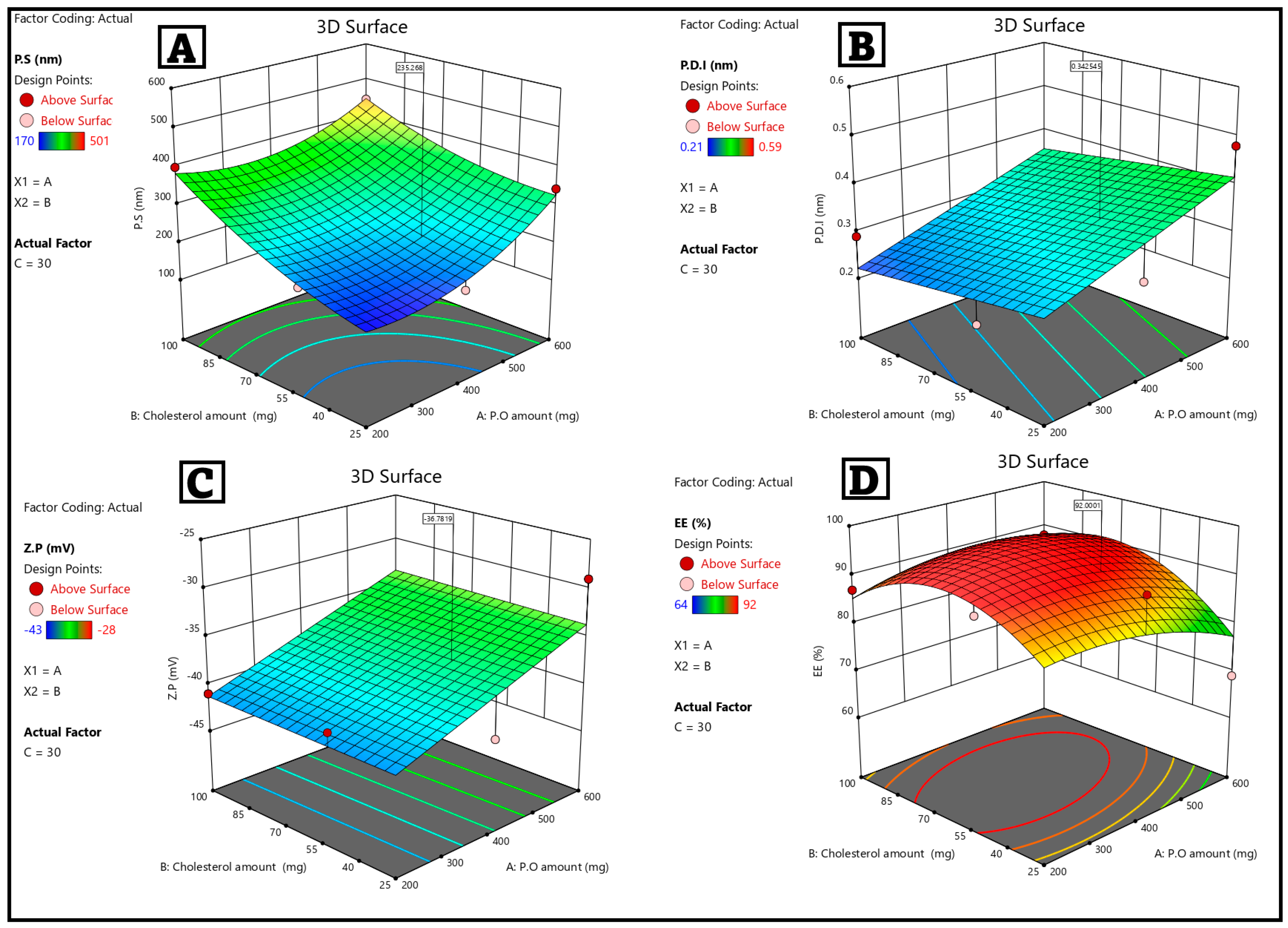 | A: P.O. Amount (mg) | B: Cholesterol Amount (mg) | C: Brij 30 Amount (mg) | P.S (nm) | PDI | Z.P (mV) | E.E (%) | |