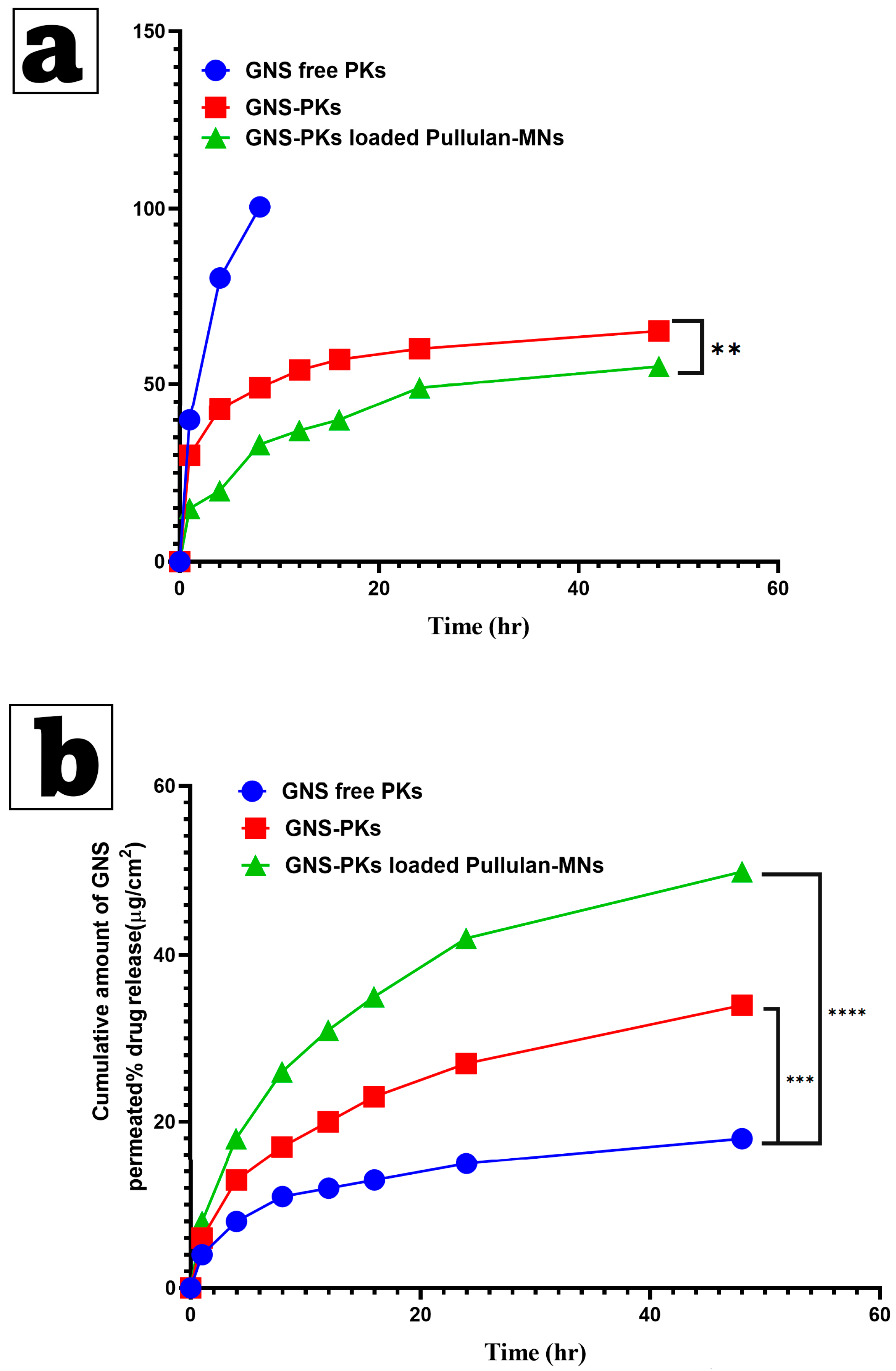 | Mechanism | Fickian diffusion | Fickian diffusion from pumpkisomes | Fickian diffusion through MNs, Pullulan, and pumpkisomes |