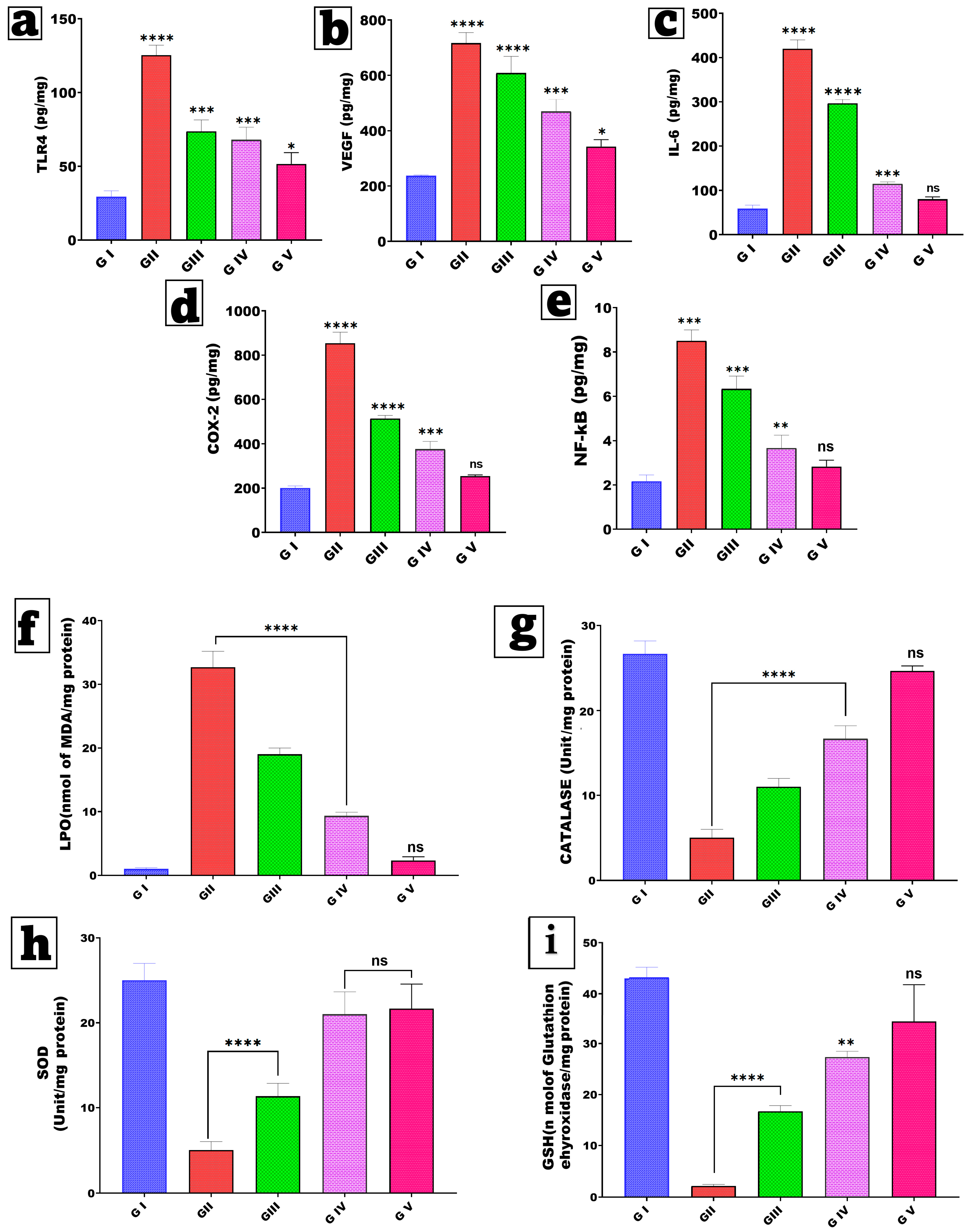 | SGPT (μ/L) | 54 ± 0.98 | 125 ± 1.23 **** | 110 ± 0.98 *** | 89 ± 0.32 ** | 67 ± 0.87 ns |