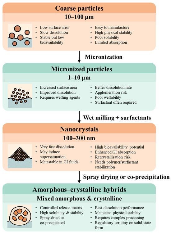| Nanocrystallization (Top-down) | <1 µm | Moderate | Moderate | Ostwald ripening, sedimentation | Poorly soluble APIs | [64,65,66] |