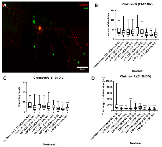 Morphological analysis in 21–28 DIV neurons transfected with KC2-ChrimsonR LNPs. (A) Morphological aspect of a cortical neuron treated with KC2-ChrimsonR LNPs (scale bar: 100 µm). 21–28 DIV rat cortical neurons treated with KC2-ChrimsonR LNPs showed reduction in morphological parameters as number of dendrites (B), branching points (C), and total length of all dendrites (D) compared with the lipofectamine treatment (Mann–Whitney test, ** p < 0.01, *** p < 0.001, **** p < 0.0001, n = number of cells, N = number of cultures).