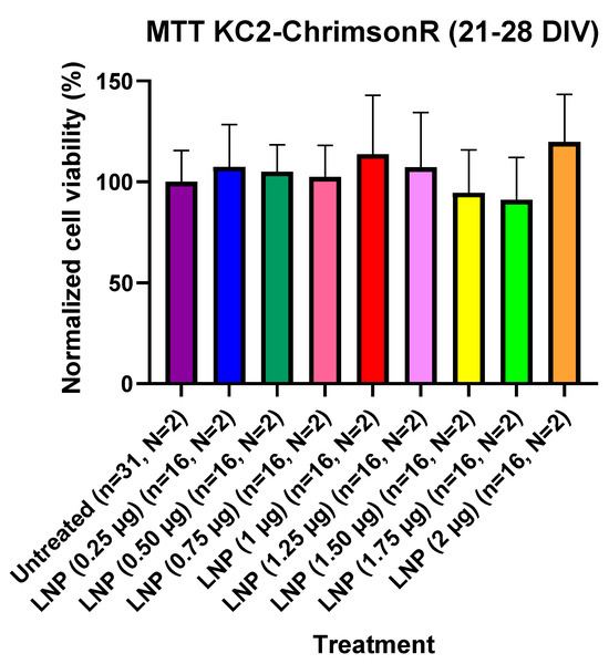 Cell viability using KC2-ChrimsonR LNPs in cortical neurons at 21–28 DIV. MTT assays performed in 21–28 DIV rat cortical neurons at 24 showed no reduction in cell viability values at any concentration compared with untreated controls (Mann–Whitney test, n = number of wells, N = number of cultures). Graph bars are expressed as mean ± SD.