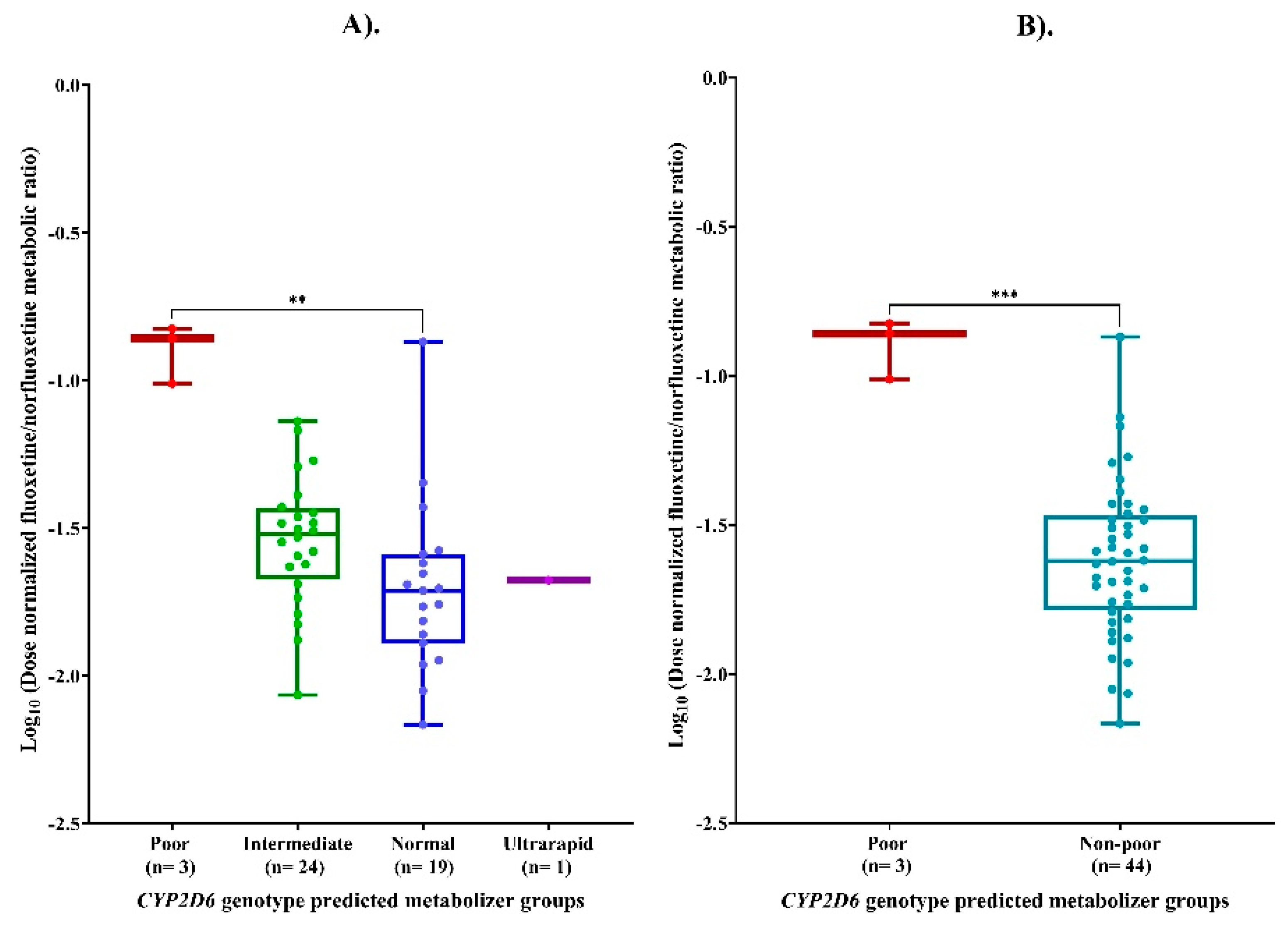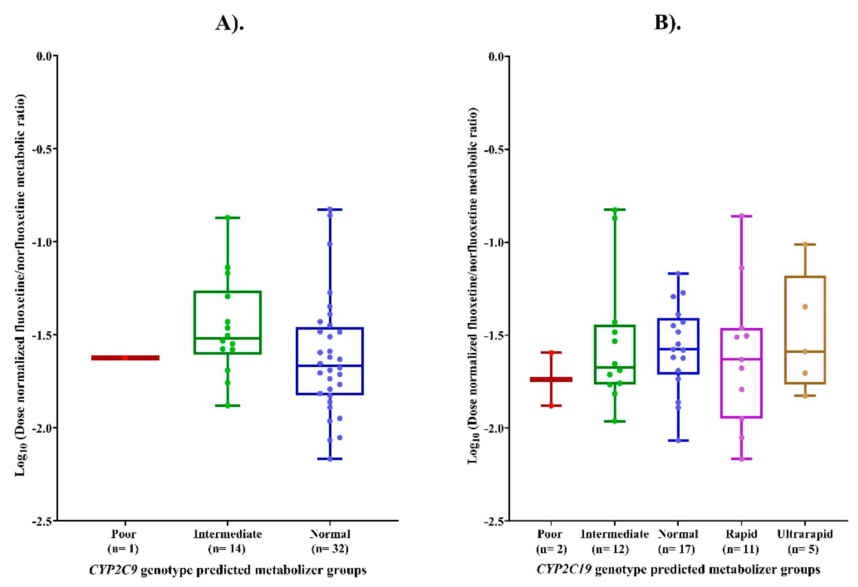 3.2. Influence of CYP2D6, CYP2C9, and CYP2C19 Genotypes on Dose-Normalized Fluoxetine/Norfluoxetine Metabolic Ratio