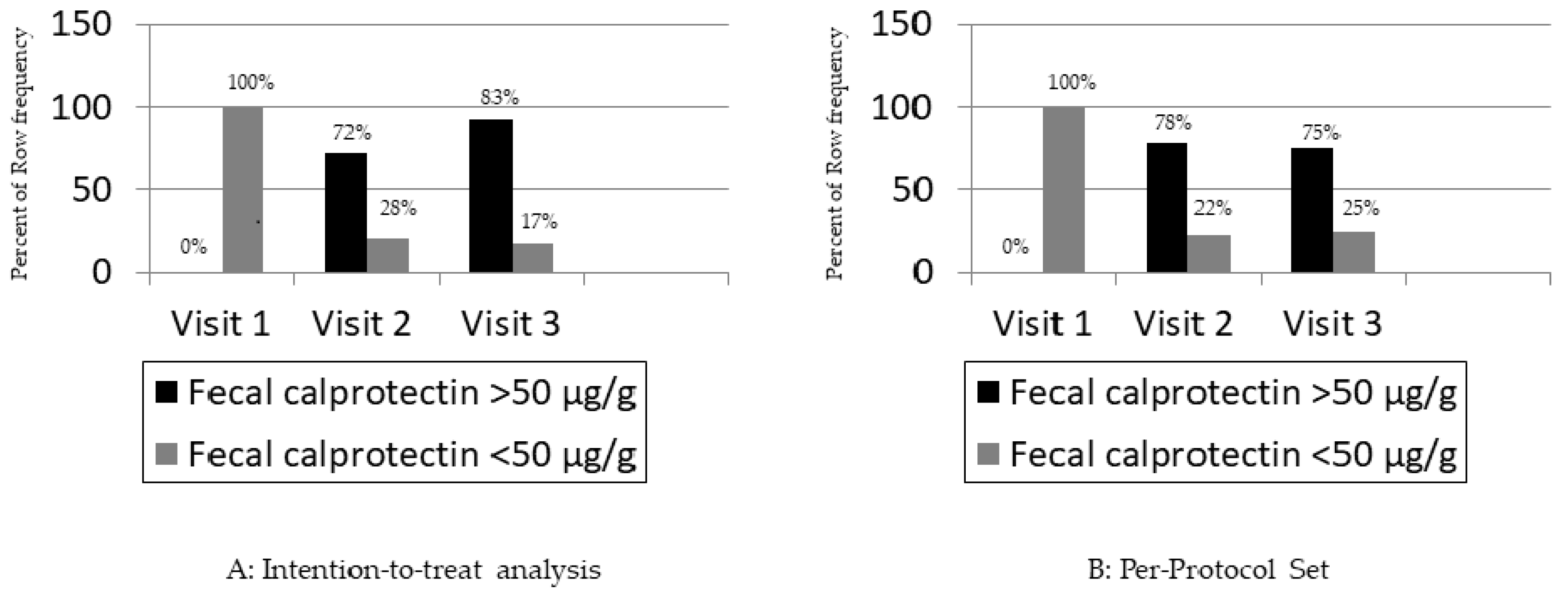 - Positivity for fecal calprotectin (FC). We used a kit provided by SOFAR S.p.A. (Trezzano Rosa, Italy), and the cut-off level for FC positivity was ≥50 µg/g;