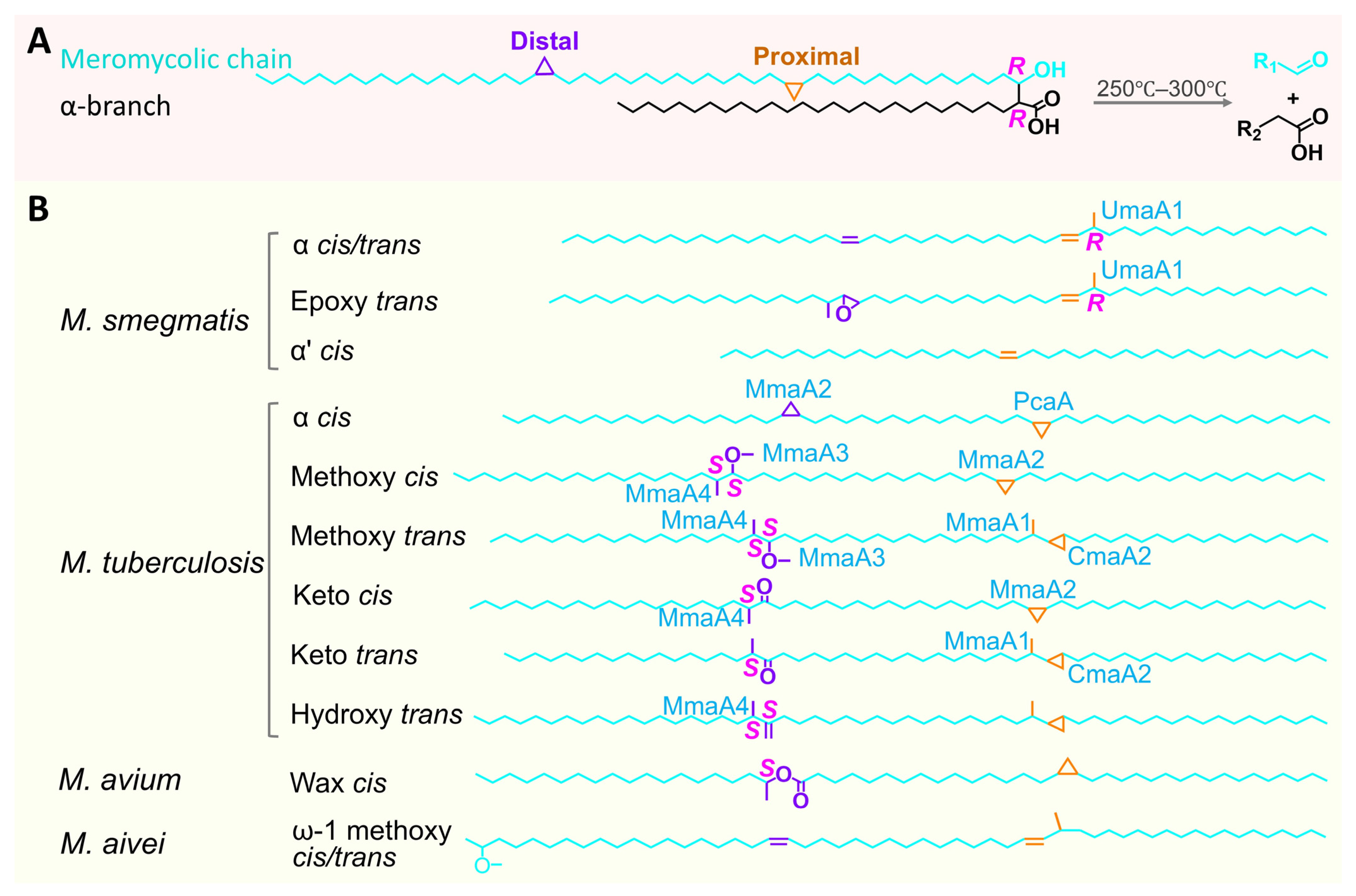 - Yuan, Y.; Crane, D.C.; Musser, J.M.; Sreevatsan, S.; Barry, C.E. MMAS-1, the Branch Point between Cis- and Trans-Cyclopropane-Containing Oxygenated Mycolates in Mycobacterium tuberculosis. J. Biol. Chem. 1997, 272, 10041–10049. [Google Scholar] [CrossRef]