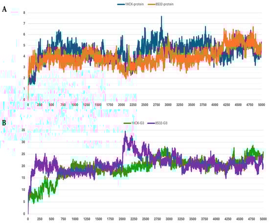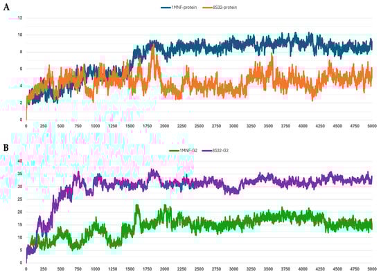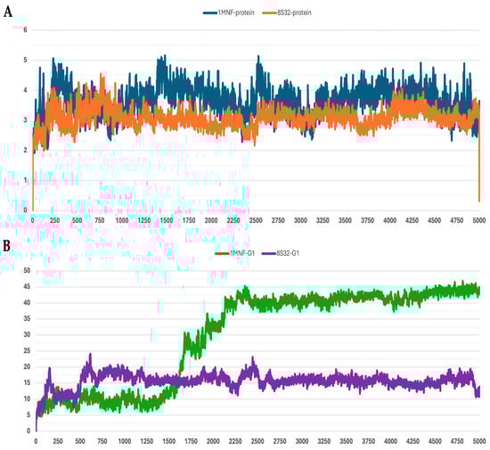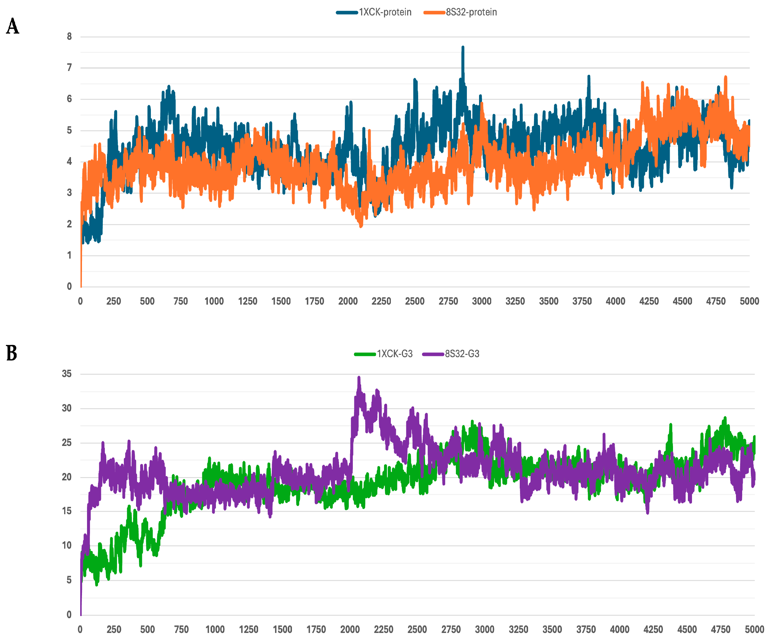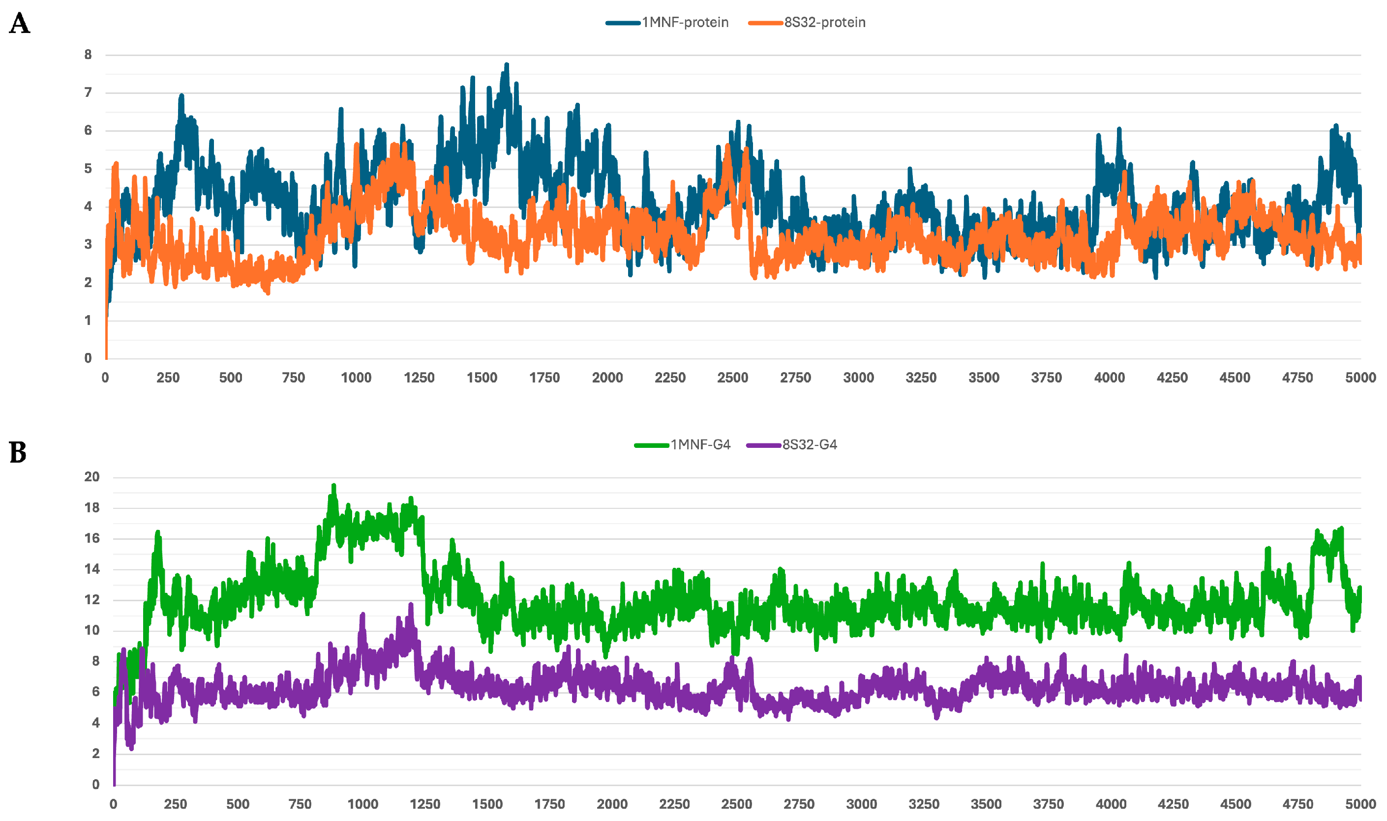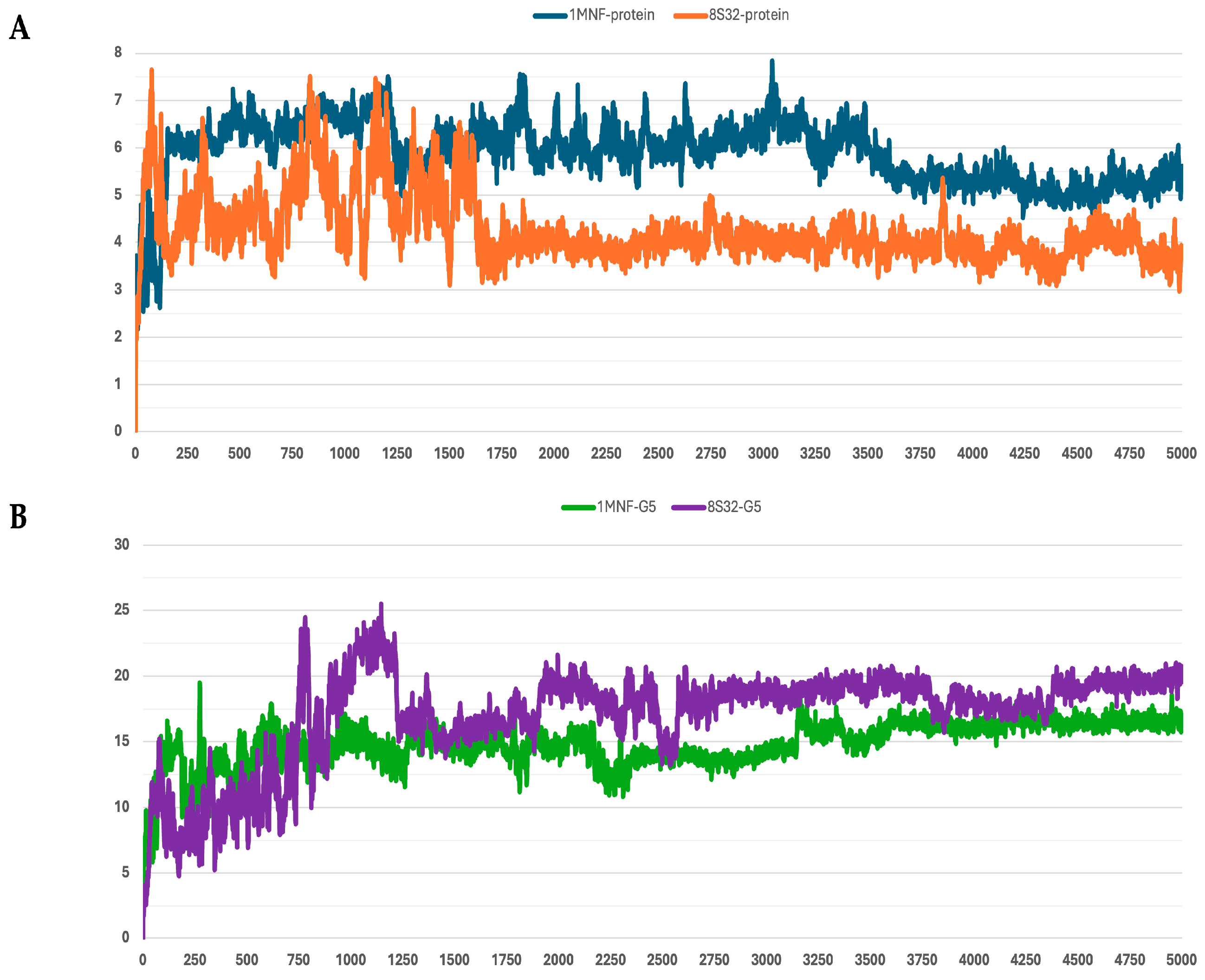 Among the analyzed systems, the most stable complex was observed for peptide G4 bound to the GroEL structure 8S32, with RMSD values of 3.26 ± 0.66 Å and 6.33 ± 1.0 Å for the protein and the ligand, respectively. This stability is also clearly reflected in Figure 4A,B. Peptide G5 also exhibited good stability when bound to both GroEL structures (1MNF and 8S32 see Figure 5B). In the case of the G5–8S32 complex, the peptide showed some instability during the first 100 ns, associated with a binding mode of rearrangement, after which the system reached a more stable conformation.