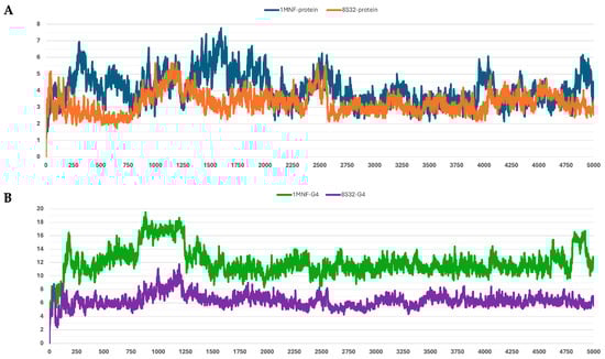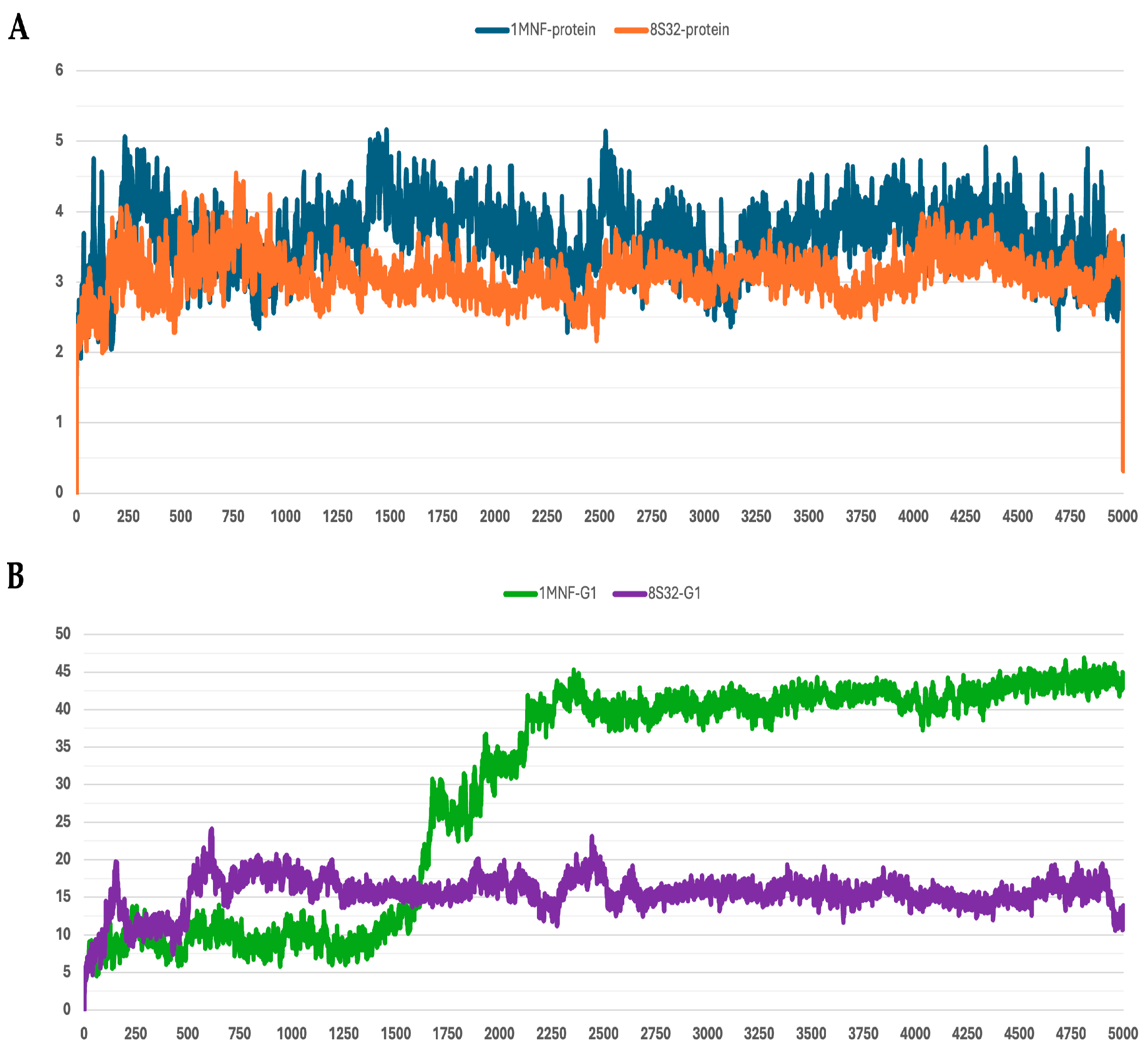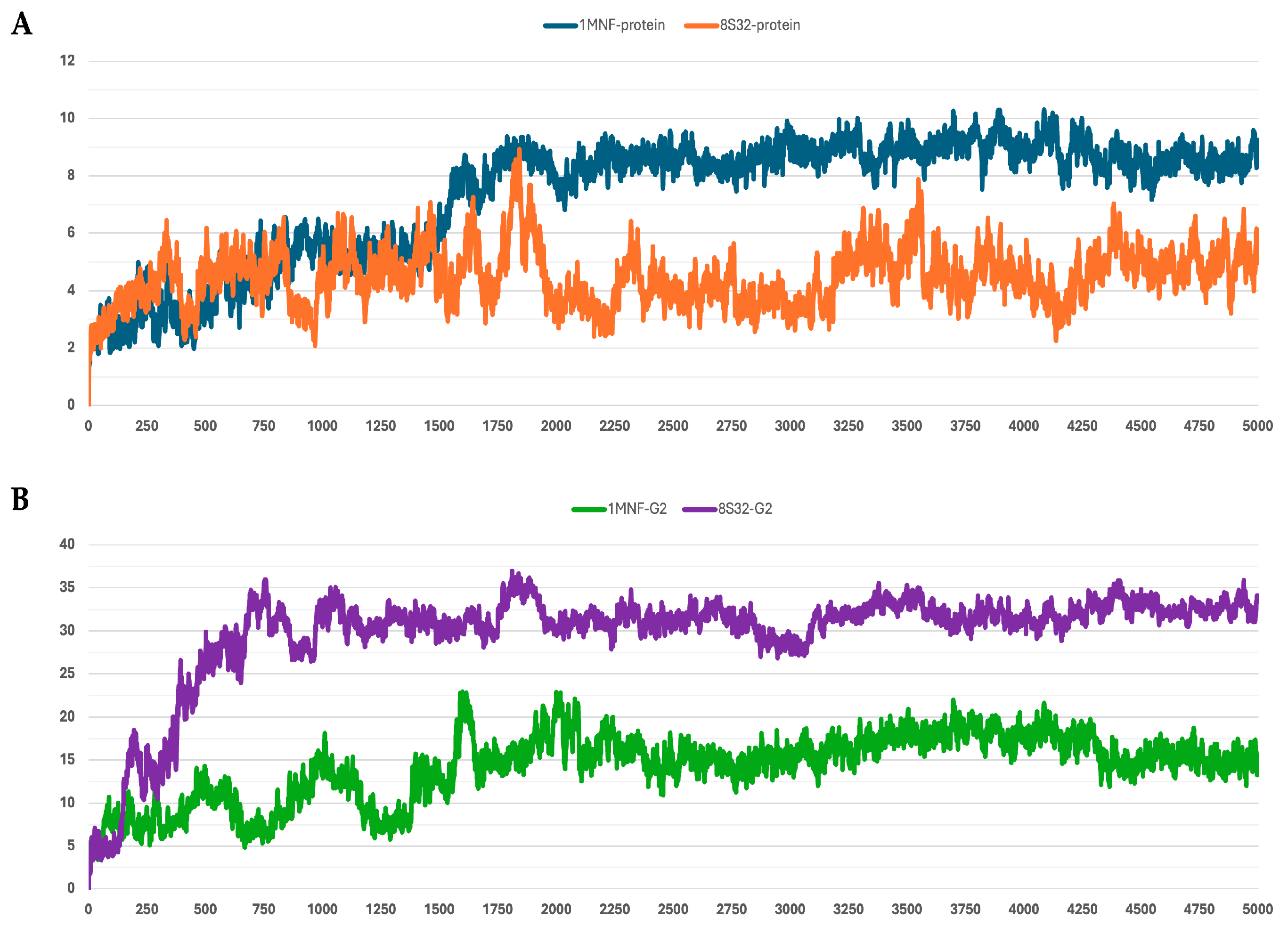 Subsequently, the MM/GBSA binding free energy was calculated for each simulation, and the results are presented in Table 4. From an energetic perspective, the most stable complex was that formed by peptide G4 bound to structure 8S32, with a binding free energy of −116.68 kcal/mol. In contrast, the complex formed by peptide G3 with the same structure was the least energetically favored, with a binding free energy of −37.88 kcal/mol. Notably, peptide G5 exhibited favorable binding free energies with both structures, 8S32 and 1MNF, with values of −58.07 kcal/mol and −57.48 kcal/mol, respectively.