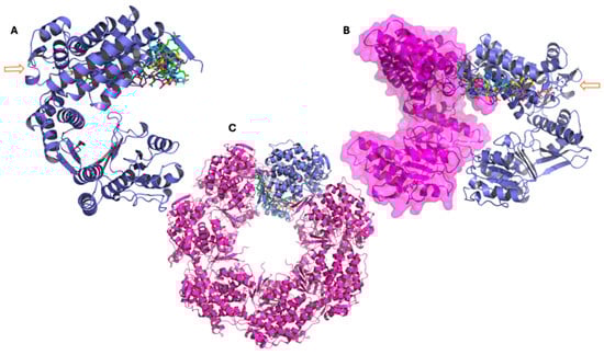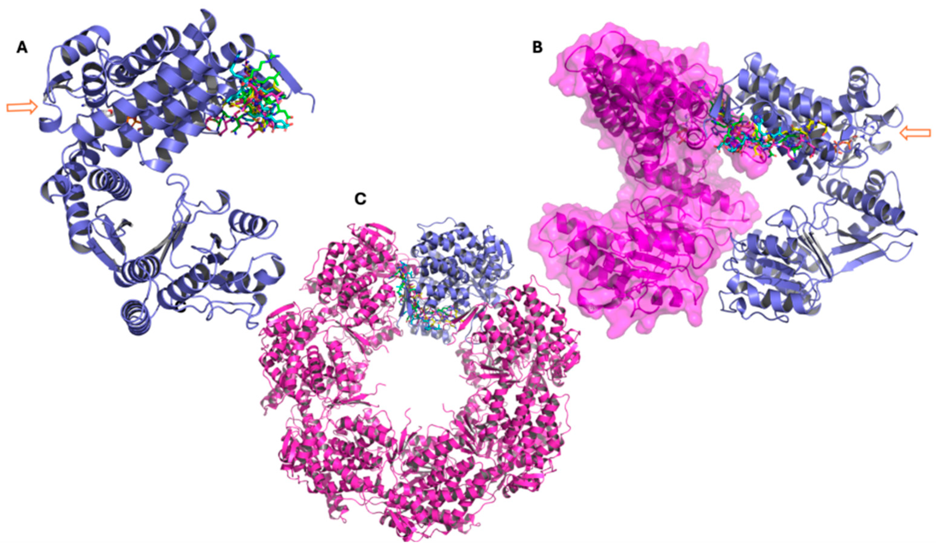 Representative conformations of peptide G4 from molecular dynamics simulations performed with the GroEL 3D structure 8S32, showing the main clusters derived from trajectory analysis. (A–C): The three panels show the GroEL complex at different structural levels. In all representations, the peptide conformation from docking is shown in cyan, while the three main clusters obtained from molecular dynamics simulations are represented in green (cluster 1), magenta (cluster 2), and yellow (cluster 3). (A) GroEL monomer (violet), with the arrow indicating the ATP molecule and the atypical ATP-binding site. (B) Dimeric GroEL structure showing the second monomer in magenta with surface representation. The arrow indicates the ATP molecule and the atypical ATP-binding site. (C) Heptameric GroEL complex (magenta), highlighting the monomer used for docking and molecular dynamics studies in violet.