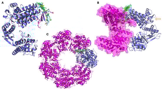 Representative conformations of peptide G5 from molecular dynamics simulations performed with the GroEL 3D structure 8S32, showing the main clusters derived from trajectory analysis. (A–C): The three panels show the GroEL complex at different structural levels. In all representations, the peptide conformation from docking is shown in cyan, while the three main clusters obtained from molecular dynamics simulations are represented in green (cluster 1), magenta (cluster 2), and yellow (cluster 3). (A) GroEL monomer (violet), with the peptide conformation from docking (in cyan), and cluster1 (in green), cluster 2 (in magenta), and cluster 3 (in yellow). (B) Dimeric GroEL structure showing the second monomer in magenta with surface representation. The arrow indicates the ATP molecule and the atypical ATP-binding site. (C) Heptameric GroEL complex (magenta), highlighting the monomer used for docking and molecular dynamics studies in violet.