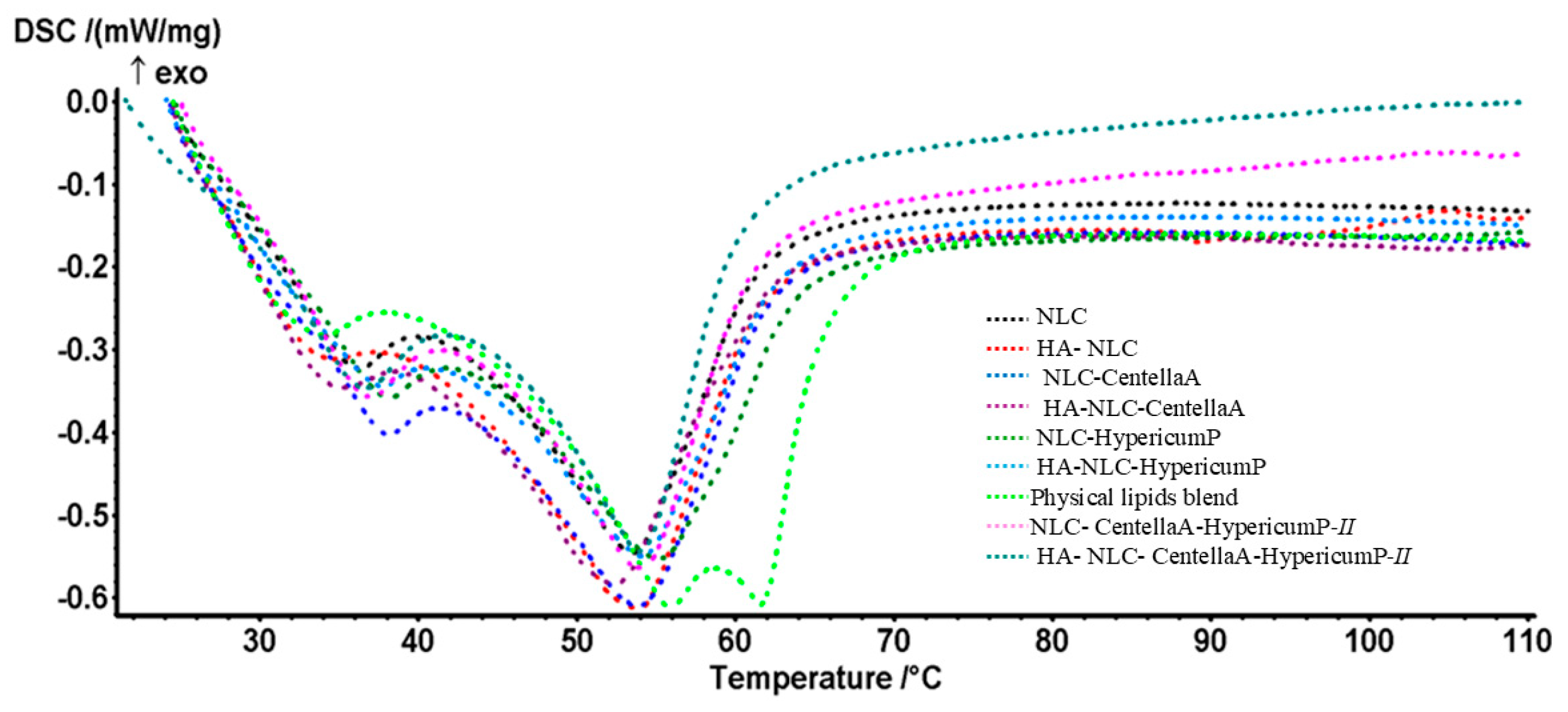 | NLC-CentellaA-HypericumP II | 1 g CentellaA + 0.5 g HypericumP | - | 197.9 ± 4.06 | 0.185 ± 0.006 | −55.7 ± 0.61 | 89.52 ± 0.10 |
