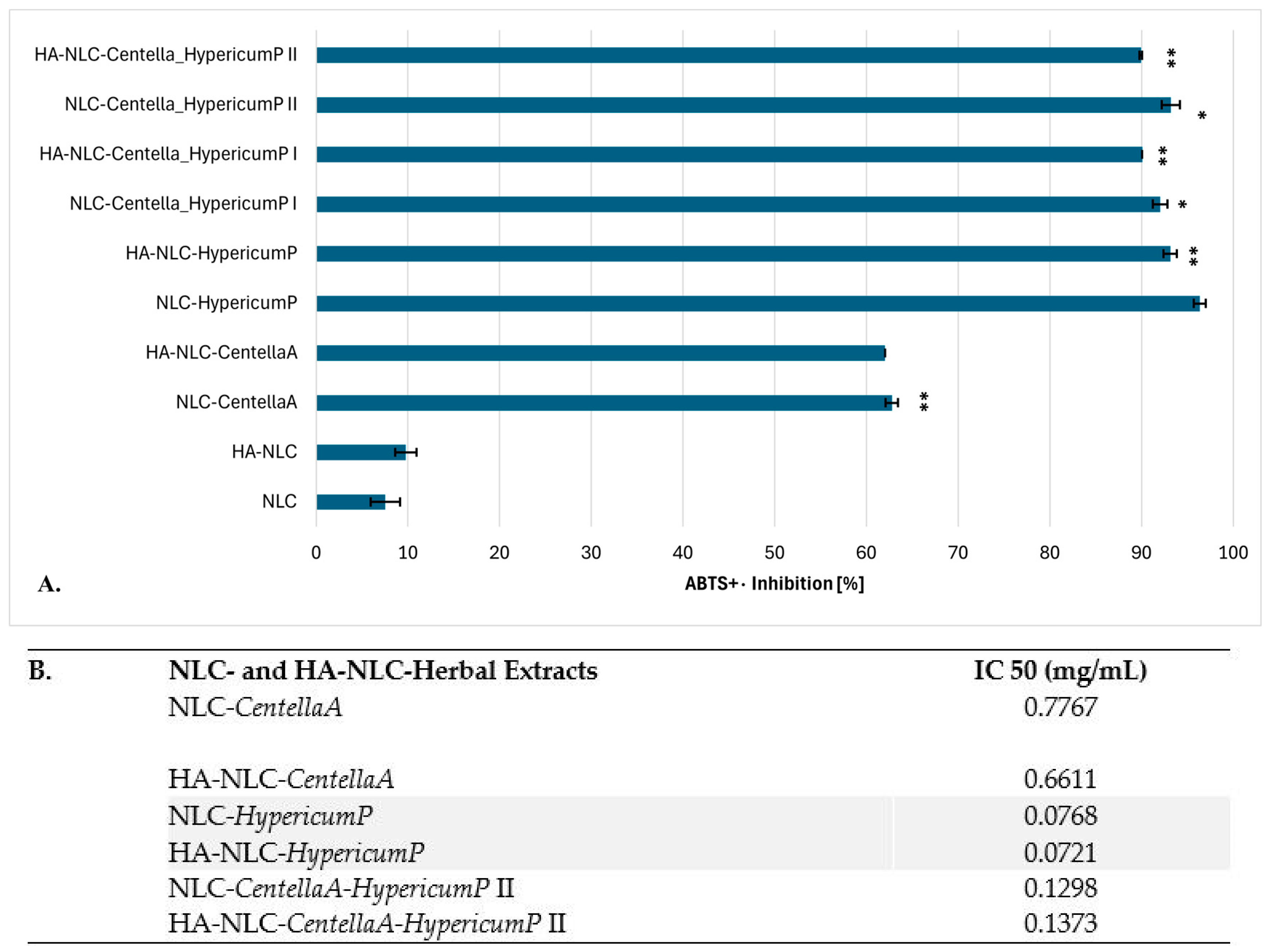 | HA-NLC-CentellaA-HypericumP I.1 | 30:10 | 224.8 ± 0.78 | 0.211 ± 0.006 | −54.4 ± 1.68 | 92.23 ± 0.36 | |