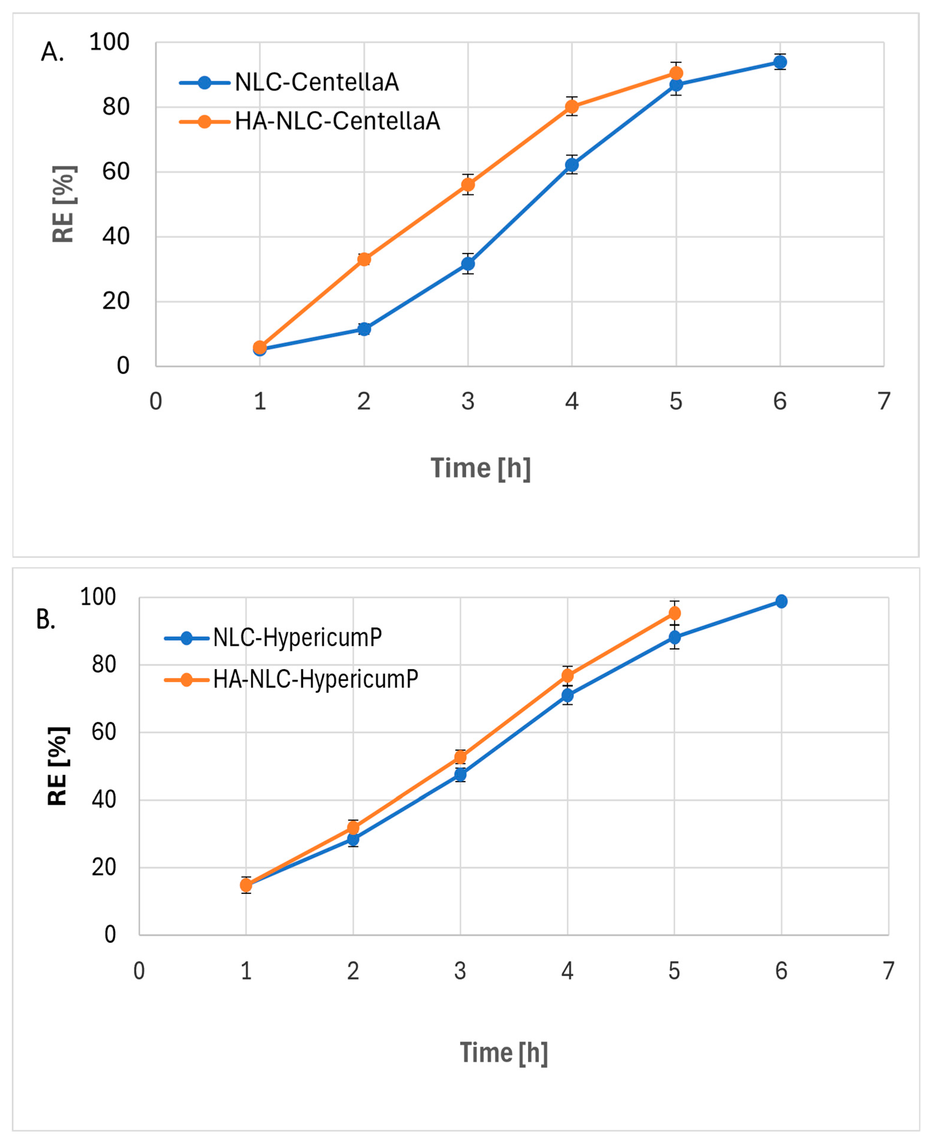 3.5. Phytochemical’s Release from NLC and HA Coated-NLC