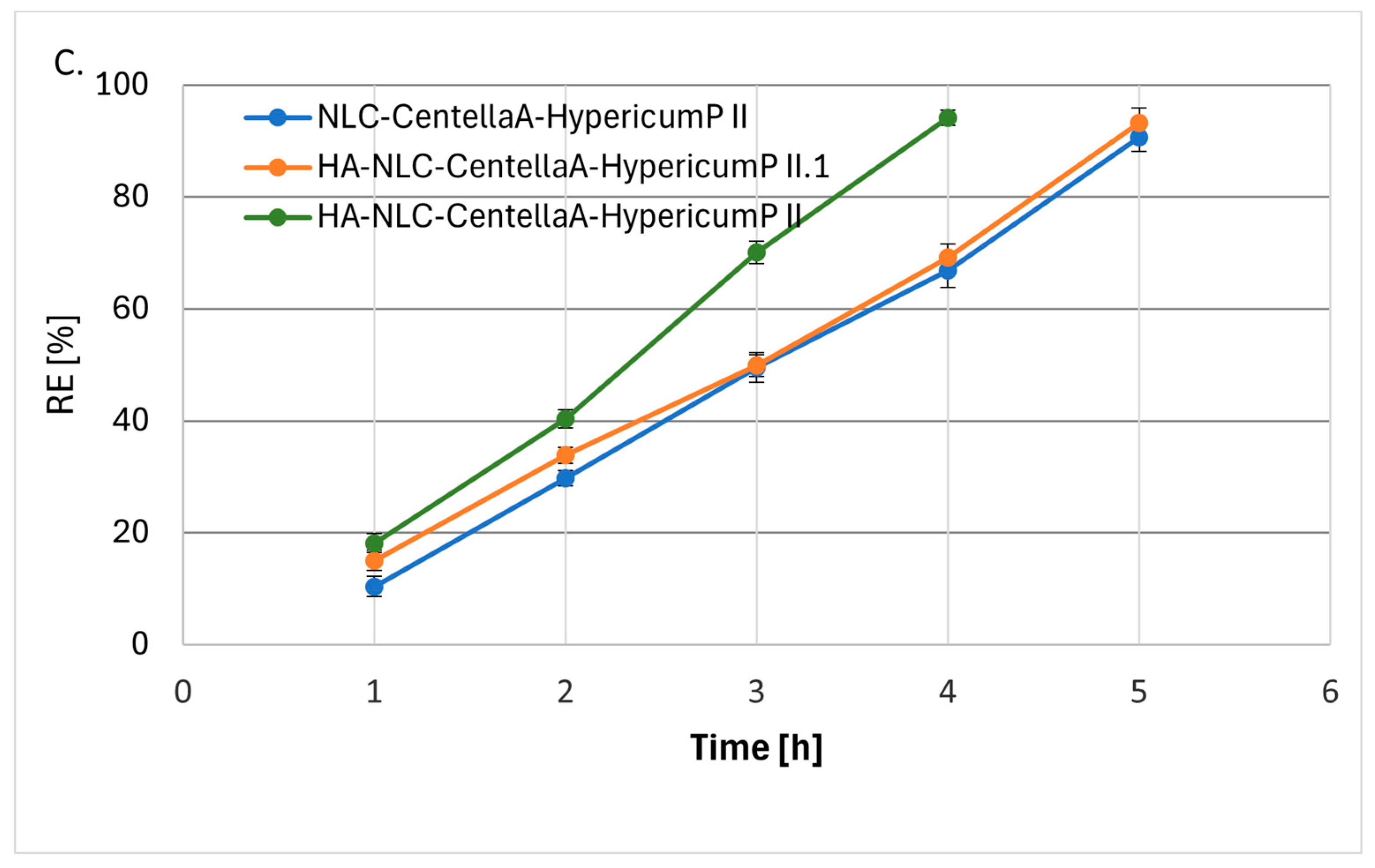 | HA-NLC-CentellaA-HypericumP II.1 | 30:10 | 193.0 ± 4.59 | 0.216 ± 0.015 | −53.9 ± 0.40 | 90.52 ± 0.21 |