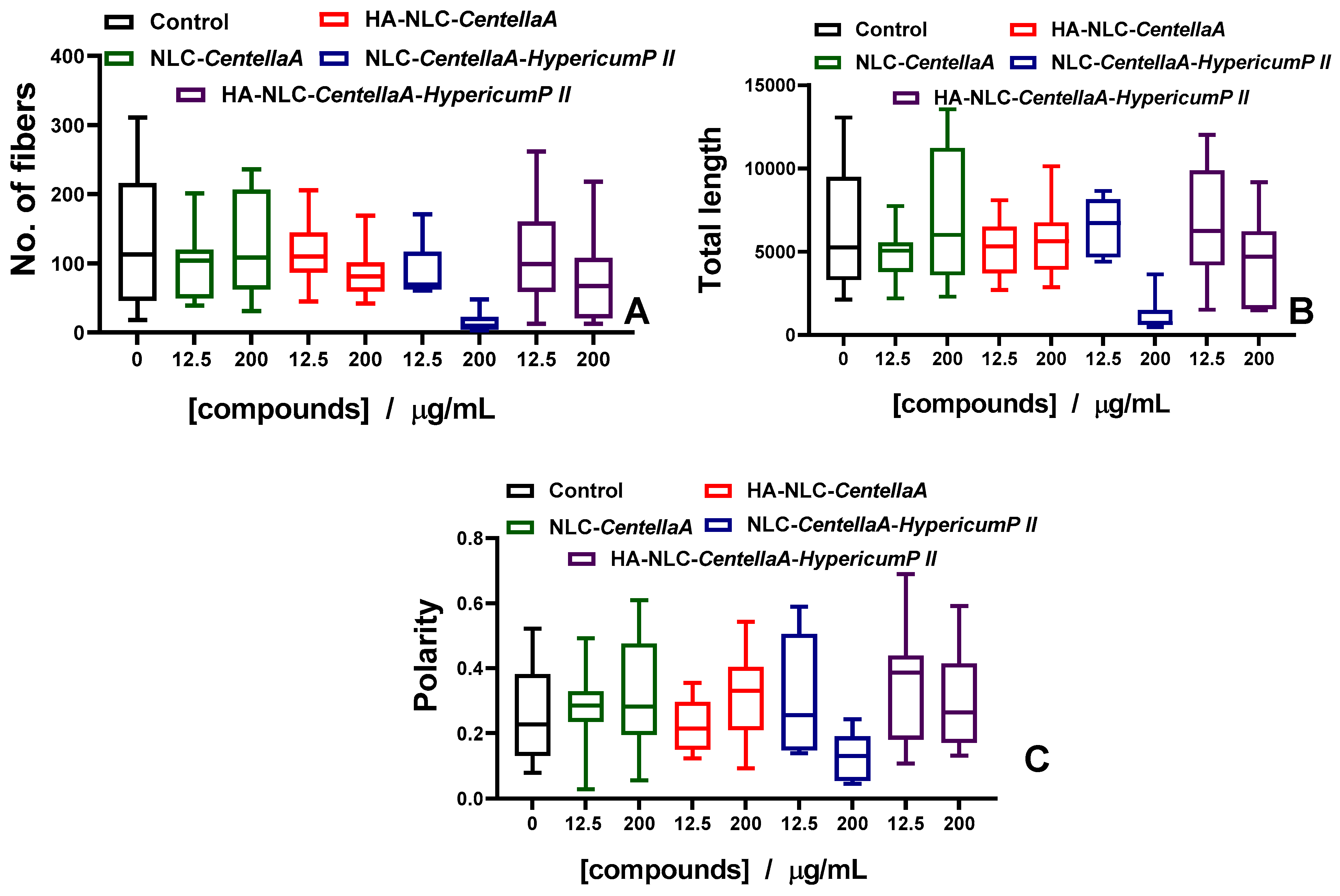 3.6. Cytotoxicity Assignment of NLC- and HA-NLC-Entrapping Herbal Extract