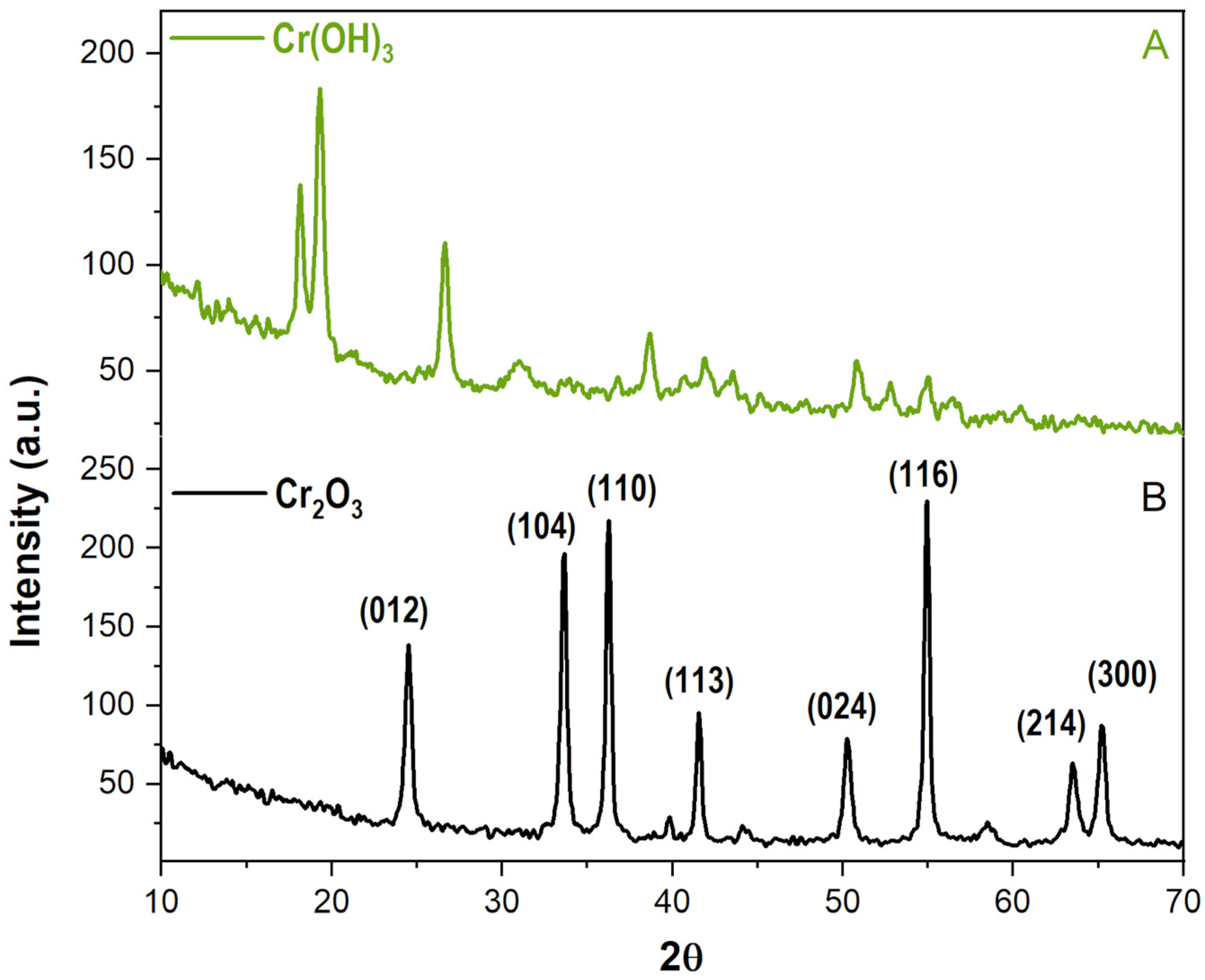 - Al-Otaibi, S. Synthesis of Chromium (III) Oxide by Pyrolysis of CrO3–Phenylalanine Precursor: Structural, Spectroscopic, and Morphological Properties of Green Cr2O3 Oxide Nanostructure. Sens. Mater. 2025, 37, 4323. [Google Scholar] [CrossRef]