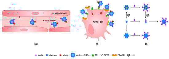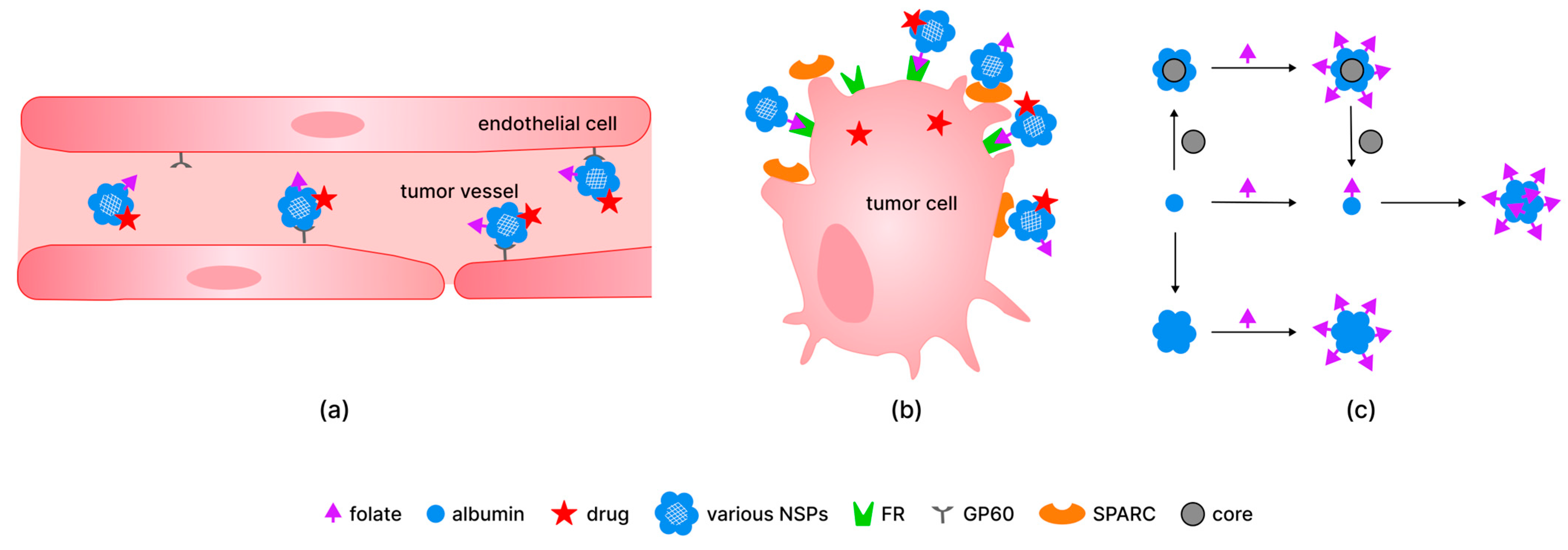 The mechanism of delivery of different systems containing folate residue, albumin, and drug in vessels (a) and into tumor cells (b); examples of the preparation of the folate-modified albumin-containing systems, particularly based on particles with cores of various (metal, silica, polymer) nature (c). Abbreviations: SPARC—secreted protein acidic and rich in cysteine; GP60—glycoprotein 60 receptor; FR—folate receptor.