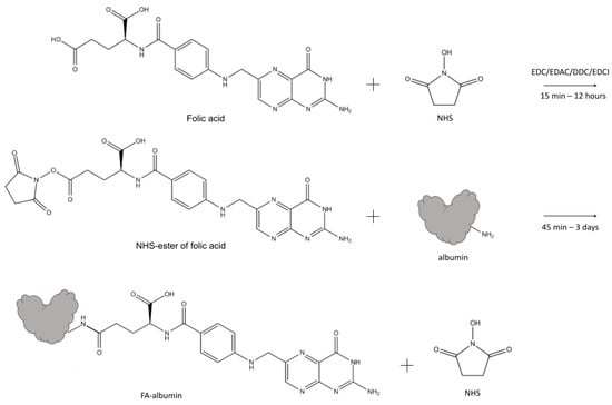 The schematic illustration of one type of synthesis of FA-albumin conjugate: NHS-esters of FA form by EDC/EDAC/DDC/EDCI activation of the terminal carboxylate of FA, followed by the formation of the amide bond with albumin. Abbreviations: NHS—N-hydroxysuccinimide; EDC—N-(3-dimethylaminopropyl)-N-ethylcarbodiimide; DCC—N,N’-dicyclohexylcarbodiimide; EDAC (or EDCI)—1-ethyl-3-(3-dimethylaminopropyl) carbodiimide; FA—folic acid.