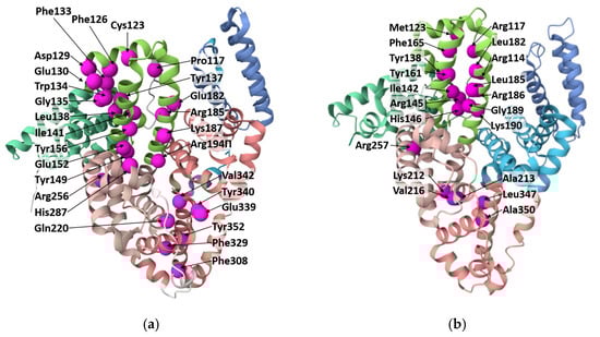 Albumin molecules with amino acids (marked as spheres) involved in binding of FA to BSA (a) and HSA (b) according to the data obtained by molecular docking and mass-spectrometry. The picture has been drawn with PDB using 4F5S (in the case of BSA) and 6M4R (in the case of HSA).
