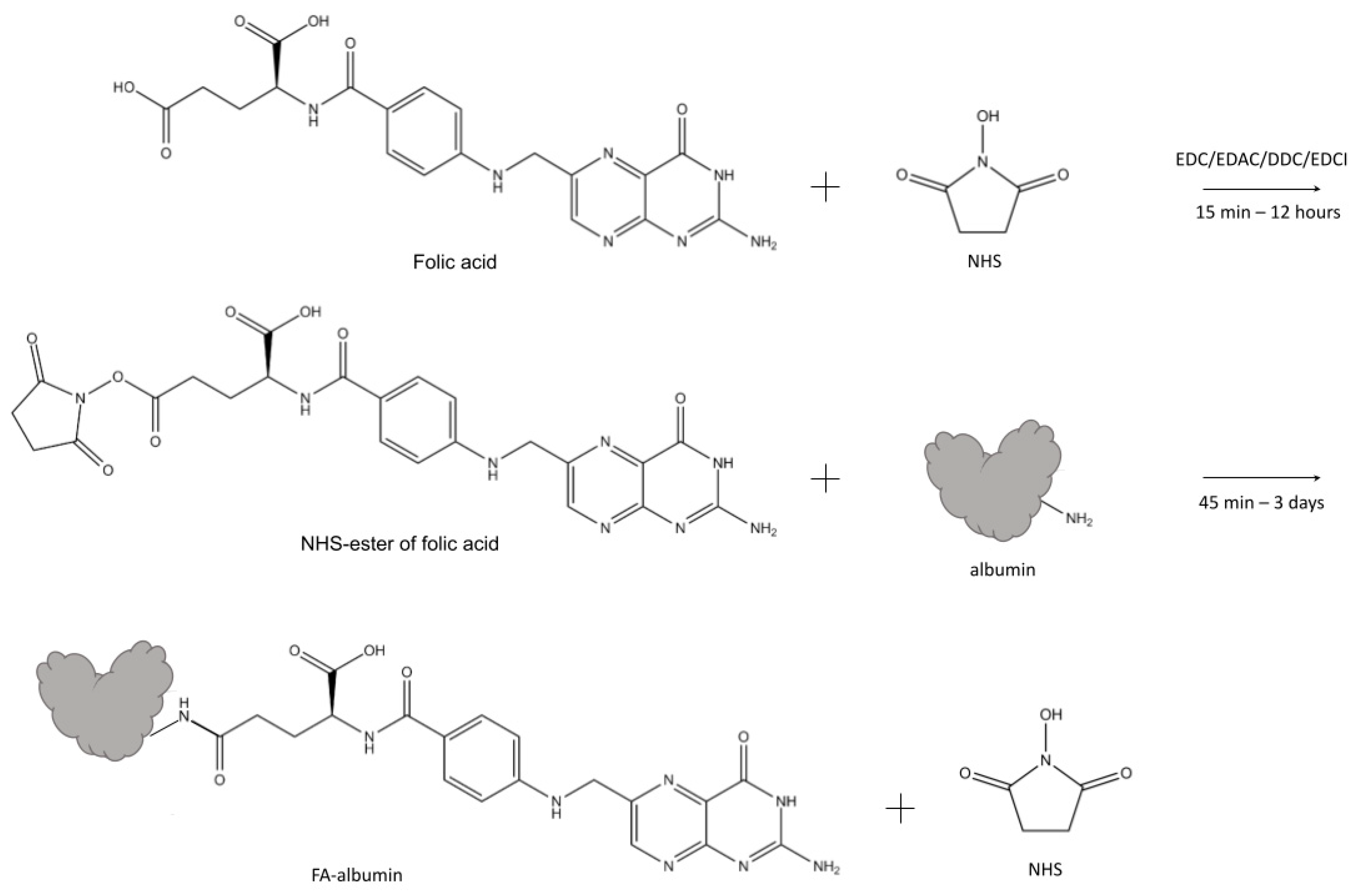 Therefore, the conjugation of NHS-esters of FA to albumin can be considered the most common and reliable way of folate binding compared to non-covalent binding between FA and albumin. Nevertheless, it is not clear in many works which form of the NHS-ester of FA and which grade of its purification are used for conjugation.