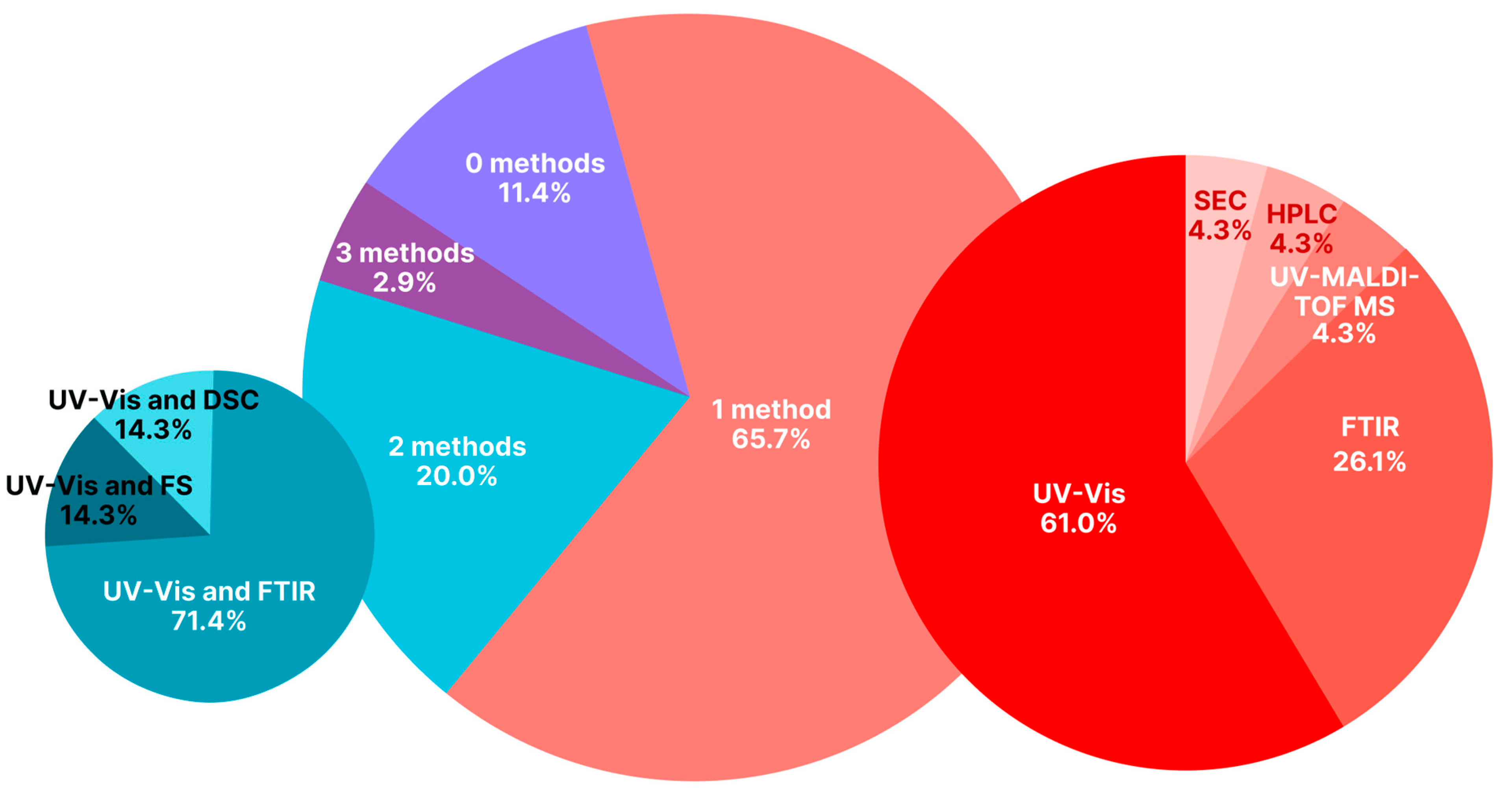 To sum up, UV spectroscopy and/or FTIR are frequently used. Sometimes DSC, X-ray diffraction, UV-MALDI-TOF MS, HPLC, and SEC are used. It is worth noting that often (in only around 1/4 of reviewed cases; see Table 1 and Figure 6) 2–3 physicochemical methods are used simultaneously for assessing the binding. At the same time, in around half of the analyzed articles, the binding was characterized quantitatively.