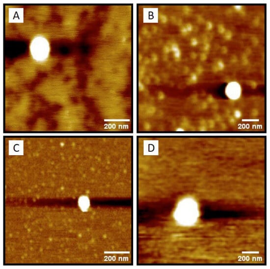 Nanoparticle’s morphology observed by AFM: (A) 77KL-NC, (B) Di3a-77KL-NC, (C) 77KL-NLC, and (D) Di3a-77KL-NLC.