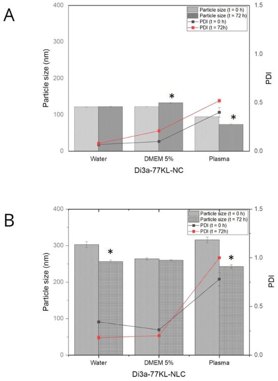 The mean particle size of nanoformulations and PDI was measured immediately after dilution (t = 0 h) and after 72 h of incubation in water, DMEM with 5% FBS, and human plasma for (A) Di3a-77KL-NC and (B) Di3a-77KL-NLC. Results are shown as mean ± SD from three independent experiments. Statistical analysis using Tukey’s test indicated significant differences between time 0 and 72 h, denoted by * (p < 0.05).