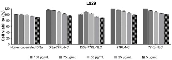 To evaluate nonspecific cytotoxicity, the L929 cell line (murine fibroblasts) was used. These non-tumor cells were obtained from the Rio de Janeiro cell bank (BCRJ, Rio de Janeiro, Brazil). The cells were cultured in DMEM (4.5 g/L glucose) supplemented with 10% (v/v) fetal bovine serum (FBS), under standard conditions (37 °C, 5% CO2). Once they reached approximately 80% confluence, the cells were harvested and then seeded into 96-well plates at a density of 1.0 × 105 cells/mL, followed by incubation for 24 h. Then, they were exposed to non-encapsulated and Di3a-loaded nanosystems for 24 h under the same culture conditions. The MTT assay was used as an endpoint to evaluate cell viability, and absorbance was measured at 550 nm using a Multiskan FC microplate reader (Thermo Fisher Scientific, Shanghai, China). The negative control (cells exposed to treatment-free medium) was taken as 100% cell viability. The cytotoxicity was also expressed in terms of IC50 (concentration causing 50% death of the cell population), calculated from concentration-response curves.