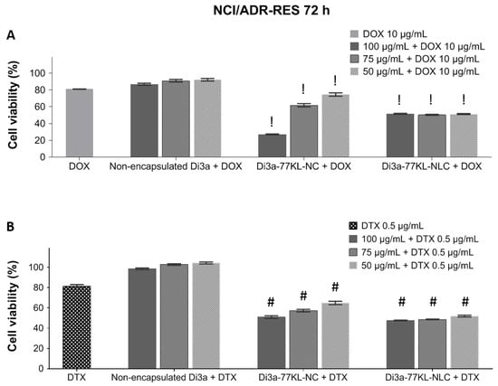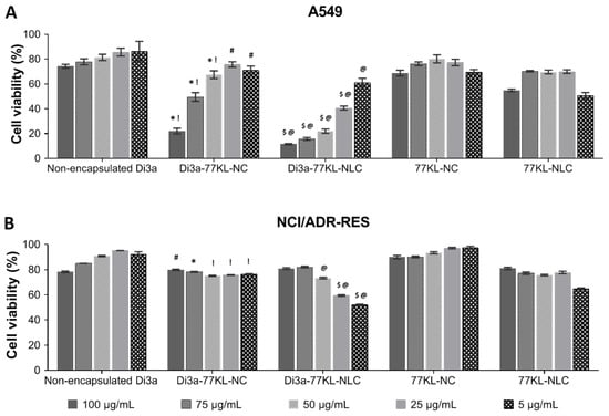 In vitro antiproliferative effects assessed by MTT assay after 72 h of treatment in (A) A549, and (B) NCI/ADR-RES cell lines. Tukey’s test showed significant differences: (A) * and $ indicate differences from unloaded NPs, p < 0.01; ! and @ denote differences from non-encapsulated Di3a, p < 0.01, # indicates difference from non-encapsulated Di3a, p < 0.05. (B) * and $ indicate differences from unloaded NPs, p < 0.01; ! and @ denote differences from non-encapsulated Di3a, p < 0.01, # indicates difference from non-encapsulated Di3a, p < 0.05.